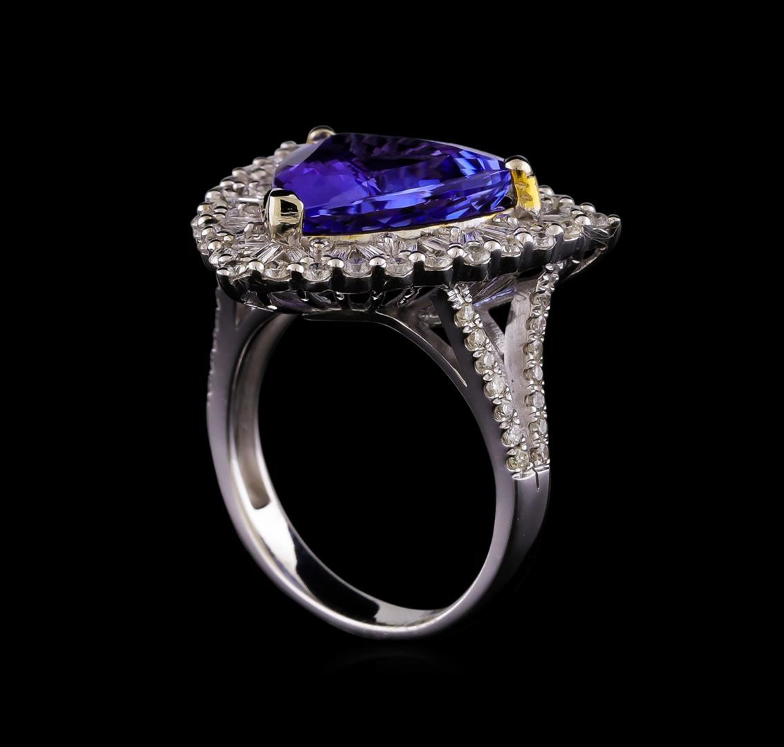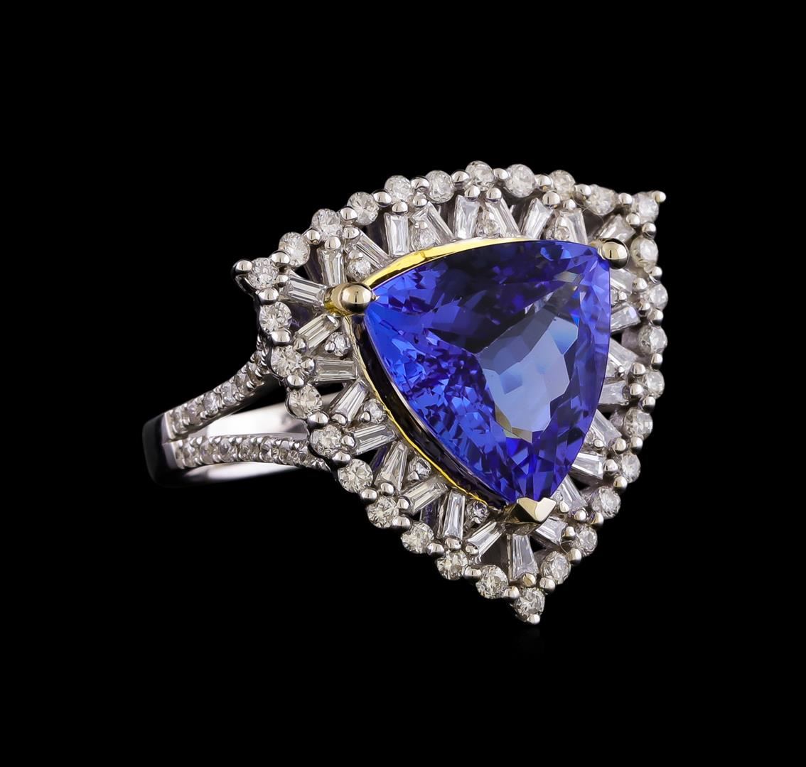 One electronically tested 14KT white and yellow gold ladies combination cast & assembled tanzanite and diamond ring with a flat shank with a bright polish finish. Identified with markings of "14K". Condition is new. Containing: One prong set triangle modified brilliant cut natural tanzanite, measuring 13.41 x 13.41 x 6.13mm, approximate weight of 6.65ct., clarity is eye clean, type I, medium light, moderately strong, bluish violet color, (GIA bV 4/4), cut is good. Seventy prong set round brilliant cut diamonds, measuring 1.50 - 1.10 x 0.78mm (depth est.) approximate total weight of 70 Stones = 0.56ct. Clarity: SI-2 to I-1. Color: H - I, Cut is Good. Twenty-Six prong set baguette cut diamonds, measuring 2.00 x 1.10 x 0.94mm (depth est.) approximate total weight of 26 Stones = 0.49ct. Clarity: SI-1 to SI-2. Color: H - I, Cut is Good. Colored gemstones are presumed to have been subjected to commonly used enhancement processes. All diamonds and colored gemstones are graded in the mounting, unless otherwise stated. Total Weight of Colored Stones 6.65ct. Total Weight of Diamonds 1.05ct. Total Weight of Ring 7.50 grams. GGL Appraised at $14,760.00.