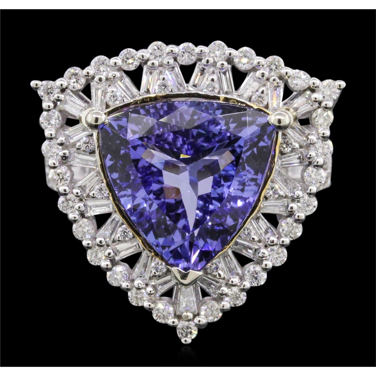 One electronically tested 14KT white and yellow gold ladies combination cast & assembled tanzanite and diamond ring with a flat shank with a bright polish finish. Identified with markings of "14K". Condition is new. Containing: One prong set triangle modified brilliant cut natural tanzanite, measuring 13.41 x 13.41 x 6.13mm, approximate weight of 6.65ct., clarity is eye clean, type I, medium light, moderately strong, bluish violet color, (GIA bV 4/4), cut is good. Seventy prong set round brilliant cut diamonds, measuring 1.50 - 1.10 x 0.78mm (depth est.) approximate total weight of 70 Stones = 0.56ct. Clarity: SI-2 to I-1. Color: H - I, Cut is Good. Twenty-Six prong set baguette cut diamonds, measuring 2.00 x 1.10 x 0.94mm (depth est.) approximate total weight of 26 Stones = 0.49ct. Clarity: SI-1 to SI-2. Color: H - I, Cut is Good. Colored gemstones are presumed to have been subjected to commonly used enhancement processes. All diamonds and colored gemstones are graded in the mounting, unless otherwise stated. Total Weight of Colored Stones 6.65ct. Total Weight of Diamonds 1.05ct. Total Weight of Ring 7.50 grams. GGL Appraised at $14,760.00.
