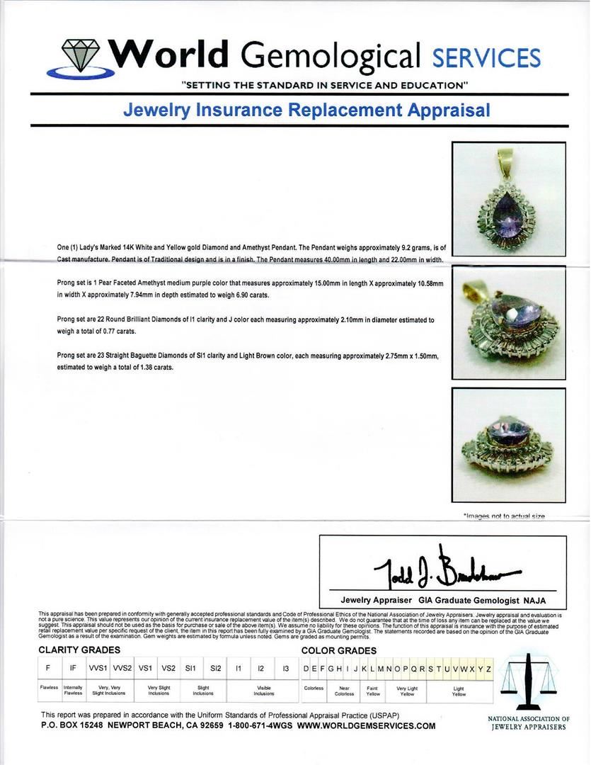 One 14KT Two Tone Gold 6.90ct Amethyst and Diamond Pendant with a total weight of 9.2 grams. Amethyst with a total weight of 6.9cts. (22) round diamonds with a total weight of 0.77cts with a color of (J) and clarity of I-1. (23) baguette diamonds with a total weight of 1.38cts with a light brown color and clarity of SI-1.