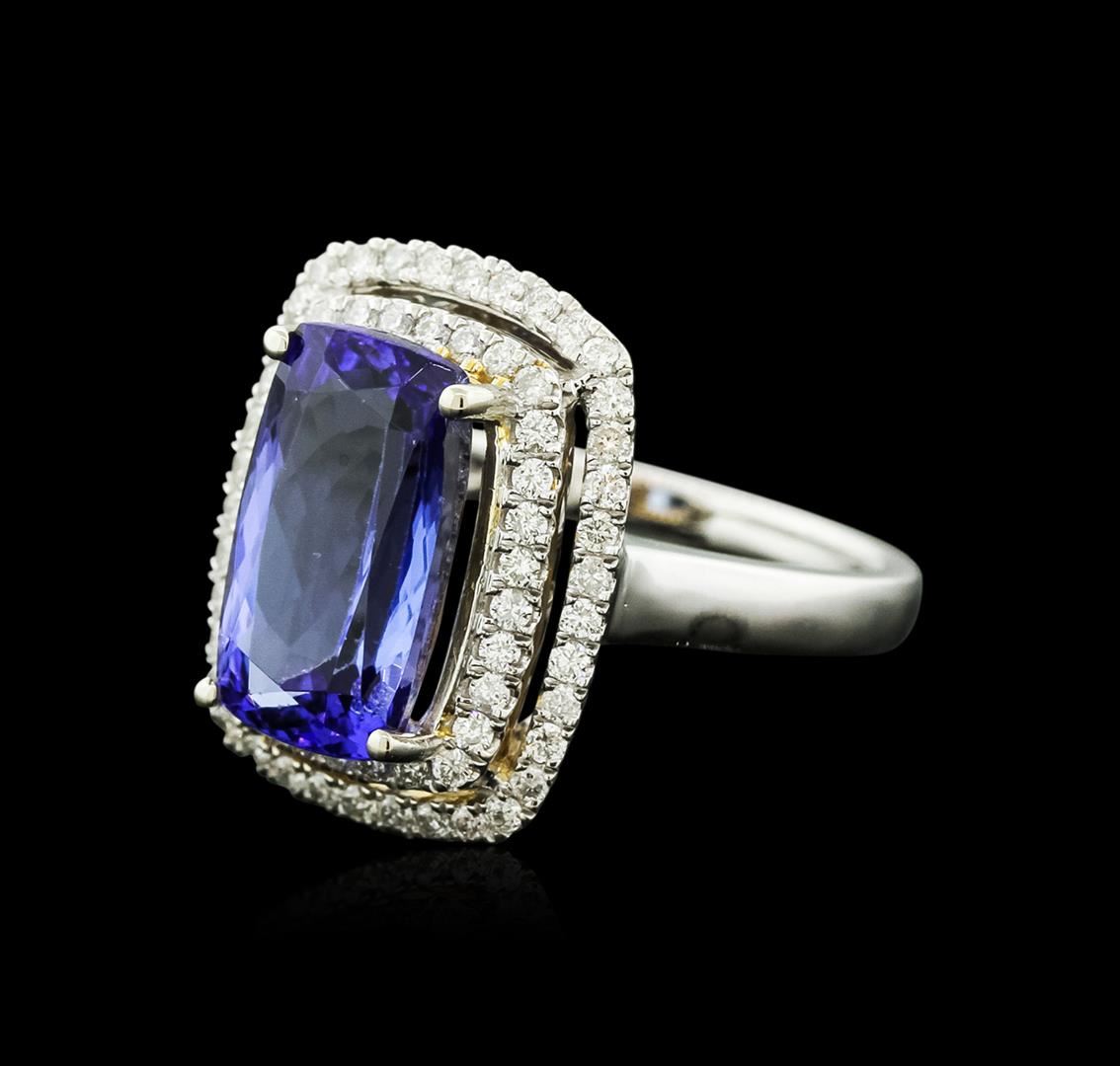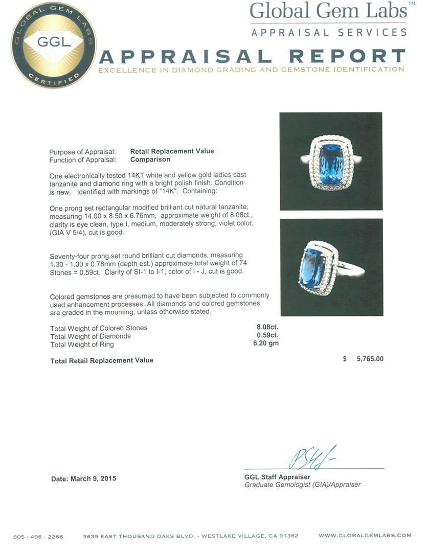 One electronically tested 14KT white and yellow gold ladies cast tanzanite and diamond ring with a bright polish finish. Identified with markings of "14K". Condition is new. Containing: One prong set rectangular modified brilliant cut natural tanzanite, measuring 14.00 x 8.50 x 6.76mm, approximate weight of 8.08ct., clarity is eye clean, type I, medium, moderately strong, violet color, (GIA V 5/4), cut is good. Seventy-Four prong set round brilliant cut diamonds, measuring 1.30 - 1.30 x 0.78mm (depth est.) approximate total weight of 74 Stones = 0.59ct. Clarity: SI-1 to I-1. Color: I - J, Cut is Good. Colored gemstones are presumed to have been subjected to commonly used enhancement processes. All diamonds and colored gemstones are graded in the mounting, unless otherwise stated. Total Weight of Colored Stones 8.08ct. Total Weight of Diamonds 0.59ct. Total Weight of Ring 6.20 grams. GGL Appraised at $5,765.00.