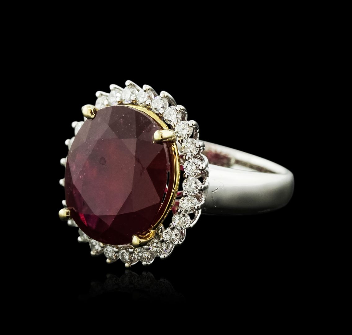 One electronically tested 14KT white and yellow gold ladies cast ruby and diamond ring with a bright polish finish. Identified with markings of "14K". Condition is new. Containing: One prong set oval modified brilliant cut natural ruby, measuring 14.00 x 12.00 x 5.81mm, approximate weight of 8.30ct., clarity is heavily included, medium dark, moderately strong, strongly purplish red color, (GIA stpR 6/4), cut is good. Twenty-Nine prong set round brilliant cut diamonds, measuring 1.80 - 1.80 x 1.08mm (depth est.) approximate total weight of 29 Stones = 0.62ct. Clarity: SI-1 to SI-2. Color: J - K. Colored gemstones are presumed to have been subjected to commonly used enhancement processes. All diamonds and colored gemstones are graded in the mounting, unless otherwise stated. Total Weight of Colored Stones 8.30ct. Total Weight of Diamonds 0.62ct. Total Weight of Ring 6.80 grams. GGL Appraised at $4,385.00.