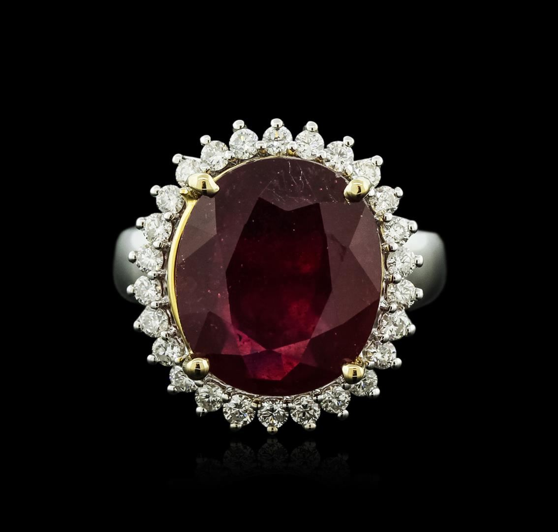 One electronically tested 14KT white and yellow gold ladies cast ruby and diamond ring with a bright polish finish. Identified with markings of "14K". Condition is new. Containing: One prong set oval modified brilliant cut natural ruby, measuring 14.00 x 12.00 x 5.81mm, approximate weight of 8.30ct., clarity is heavily included, medium dark, moderately strong, strongly purplish red color, (GIA stpR 6/4), cut is good. Twenty-Nine prong set round brilliant cut diamonds, measuring 1.80 - 1.80 x 1.08mm (depth est.) approximate total weight of 29 Stones = 0.62ct. Clarity: SI-1 to SI-2. Color: J - K. Colored gemstones are presumed to have been subjected to commonly used enhancement processes. All diamonds and colored gemstones are graded in the mounting, unless otherwise stated. Total Weight of Colored Stones 8.30ct. Total Weight of Diamonds 0.62ct. Total Weight of Ring 6.80 grams. GGL Appraised at $4,385.00.