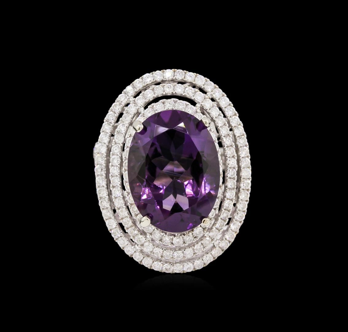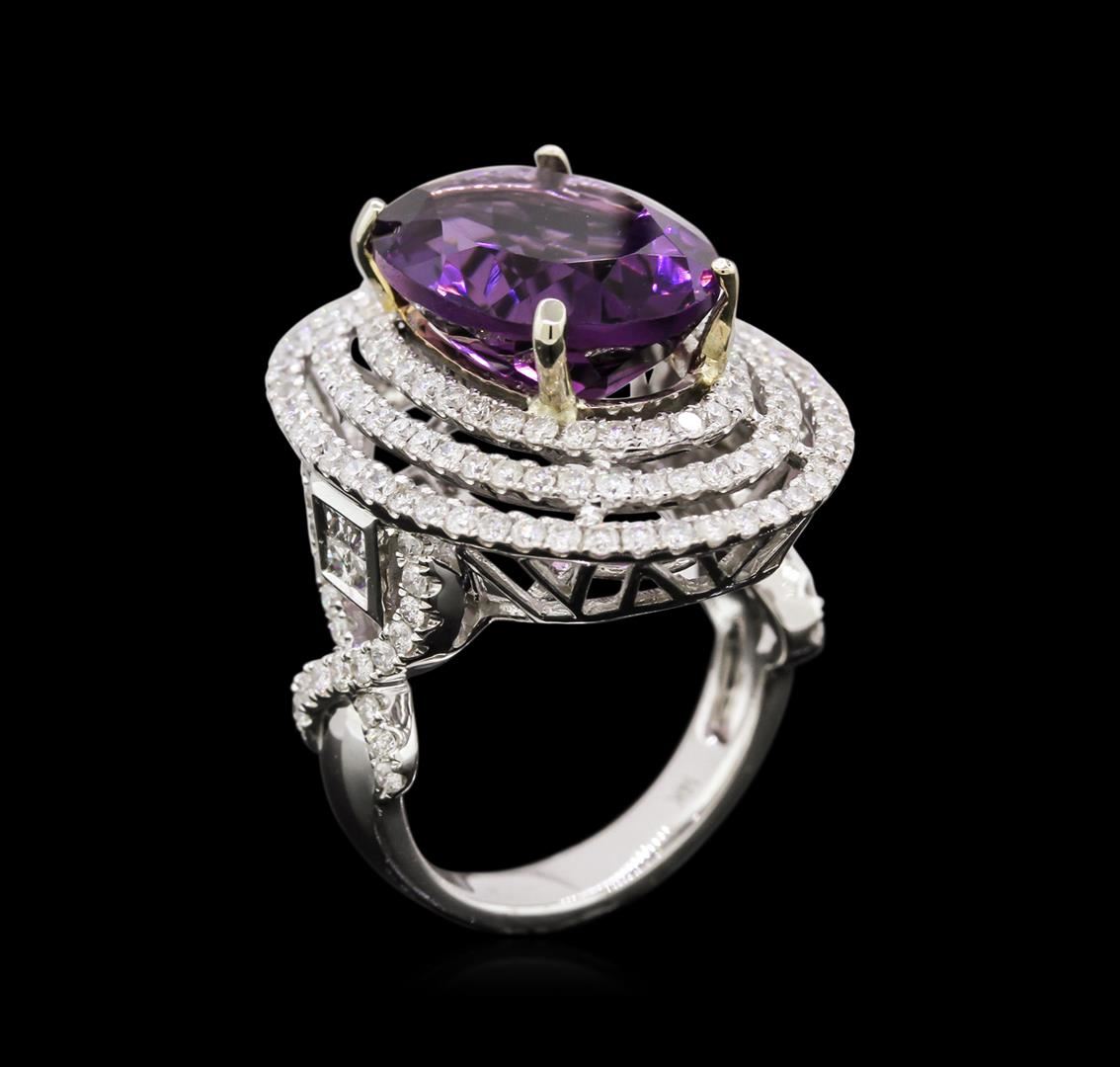 One electronically tested 14KT white and yellow gold Ladies combination cast & assembled ring with a bright polish finish. Condition is new. Identified with markings of "14K". Containing: One Hundred Sixty-Seven prong set round brilliant cut diamonds, measuring 1.30 - 1.30 x 0.78mm (depth est.) approximate. Total Weight of 167 Stones = 1.95ct. Clarity: I-1 to I-2. Color: H - I, Cut is Good. Eight invisible set princess cut diamonds, measuring 1.70 x 1.70 x 1.28mm (depth est.) approximate. Total Weight of 8 Stones = 0.24ct. Clarity: SI-2. Color: H - I, Cut is Good. One prong set oval modified brilliant cut natural amethyst, measuring 15.95 x 11.97 x 7.78mm, approximate weight of 8.70ct., clarity is eye clean, type II, medium, moderately strong, purple color, (GIA P 5/4), cut is good. Colored gemstones are presumed to have been subjected to commonly used color/clarity enhancement processes. Total Weight of Colored Stones 8.70ct. Total Weight of Diamonds 2.19ct. Total Weight of Ring 10.70 grams. GGL Appraised at $8,590.00.