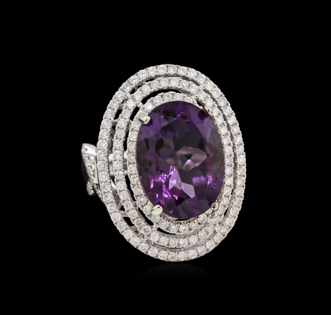 One electronically tested 14KT white and yellow gold Ladies combination cast & assembled ring with a bright polish finish. Condition is new. Identified with markings of "14K". Containing: One Hundred Sixty-Seven prong set round brilliant cut diamonds, measuring 1.30 - 1.30 x 0.78mm (depth est.) approximate. Total Weight of 167 Stones = 1.95ct. Clarity: I-1 to I-2. Color: H - I, Cut is Good. Eight invisible set princess cut diamonds, measuring 1.70 x 1.70 x 1.28mm (depth est.) approximate. Total Weight of 8 Stones = 0.24ct. Clarity: SI-2. Color: H - I, Cut is Good. One prong set oval modified brilliant cut natural amethyst, measuring 15.95 x 11.97 x 7.78mm, approximate weight of 8.70ct., clarity is eye clean, type II, medium, moderately strong, purple color, (GIA P 5/4), cut is good. Colored gemstones are presumed to have been subjected to commonly used color/clarity enhancement processes. Total Weight of Colored Stones 8.70ct. Total Weight of Diamonds 2.19ct. Total Weight of Ring 10.70 grams. GGL Appraised at $8,590.00.