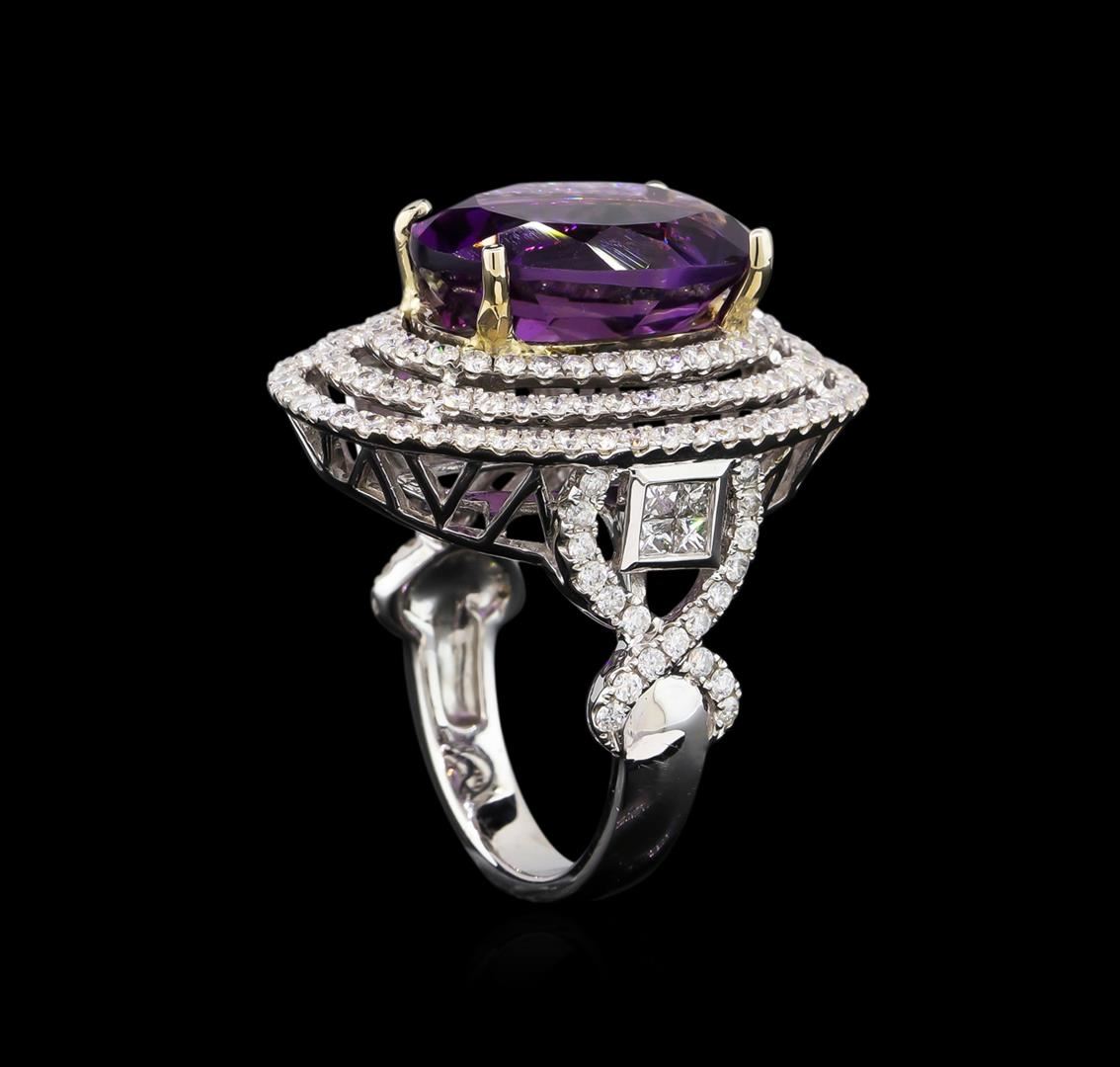 One electronically tested 14KT white and yellow gold Ladies combination cast & assembled ring with a bright polish finish. Condition is new. Identified with markings of "14K". Containing: One Hundred Sixty-Seven prong set round brilliant cut diamonds, measuring 1.30 - 1.30 x 0.78mm (depth est.) approximate. Total Weight of 167 Stones = 1.95ct. Clarity: I-1 to I-2. Color: H - I, Cut is Good. Eight invisible set princess cut diamonds, measuring 1.70 x 1.70 x 1.28mm (depth est.) approximate. Total Weight of 8 Stones = 0.24ct. Clarity: SI-2. Color: H - I, Cut is Good. One prong set oval modified brilliant cut natural amethyst, measuring 15.95 x 11.97 x 7.78mm, approximate weight of 8.70ct., clarity is eye clean, type II, medium, moderately strong, purple color, (GIA P 5/4), cut is good. Colored gemstones are presumed to have been subjected to commonly used color/clarity enhancement processes. Total Weight of Colored Stones 8.70ct. Total Weight of Diamonds 2.19ct. Total Weight of Ring 10.70 grams. GGL Appraised at $8,590.00.