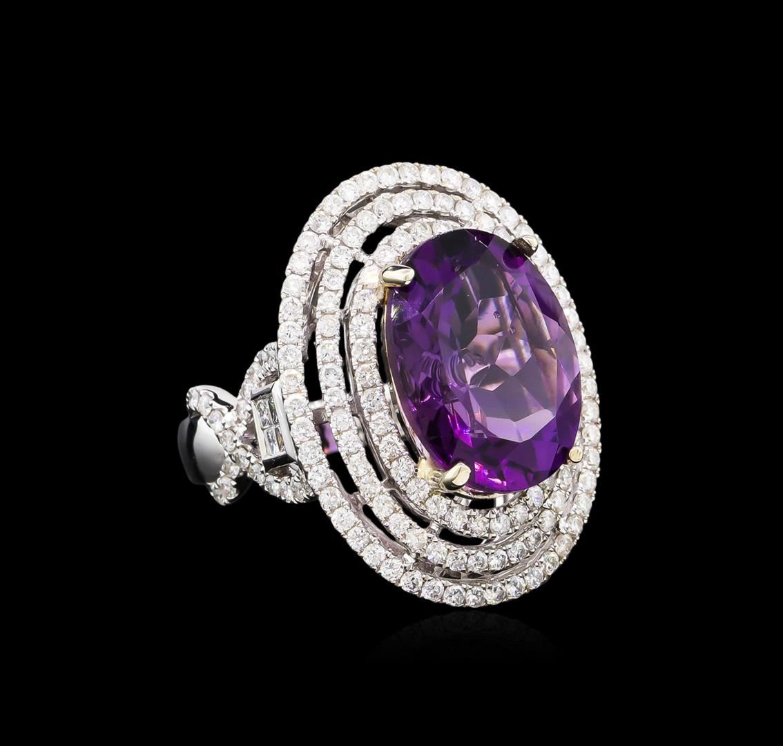 One electronically tested 14KT white and yellow gold Ladies combination cast & assembled ring with a bright polish finish. Condition is new. Identified with markings of "14K". Containing: One Hundred Sixty-Seven prong set round brilliant cut diamonds, measuring 1.30 - 1.30 x 0.78mm (depth est.) approximate. Total Weight of 167 Stones = 1.95ct. Clarity: I-1 to I-2. Color: H - I, Cut is Good. Eight invisible set princess cut diamonds, measuring 1.70 x 1.70 x 1.28mm (depth est.) approximate. Total Weight of 8 Stones = 0.24ct. Clarity: SI-2. Color: H - I, Cut is Good. One prong set oval modified brilliant cut natural amethyst, measuring 15.95 x 11.97 x 7.78mm, approximate weight of 8.70ct., clarity is eye clean, type II, medium, moderately strong, purple color, (GIA P 5/4), cut is good. Colored gemstones are presumed to have been subjected to commonly used color/clarity enhancement processes. Total Weight of Colored Stones 8.70ct. Total Weight of Diamonds 2.19ct. Total Weight of Ring 10.70 grams. GGL Appraised at $8,590.00.