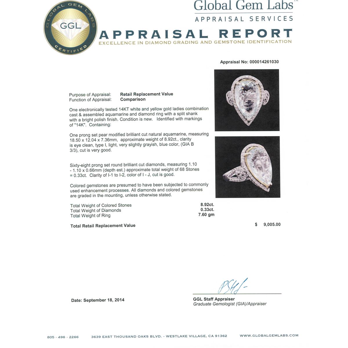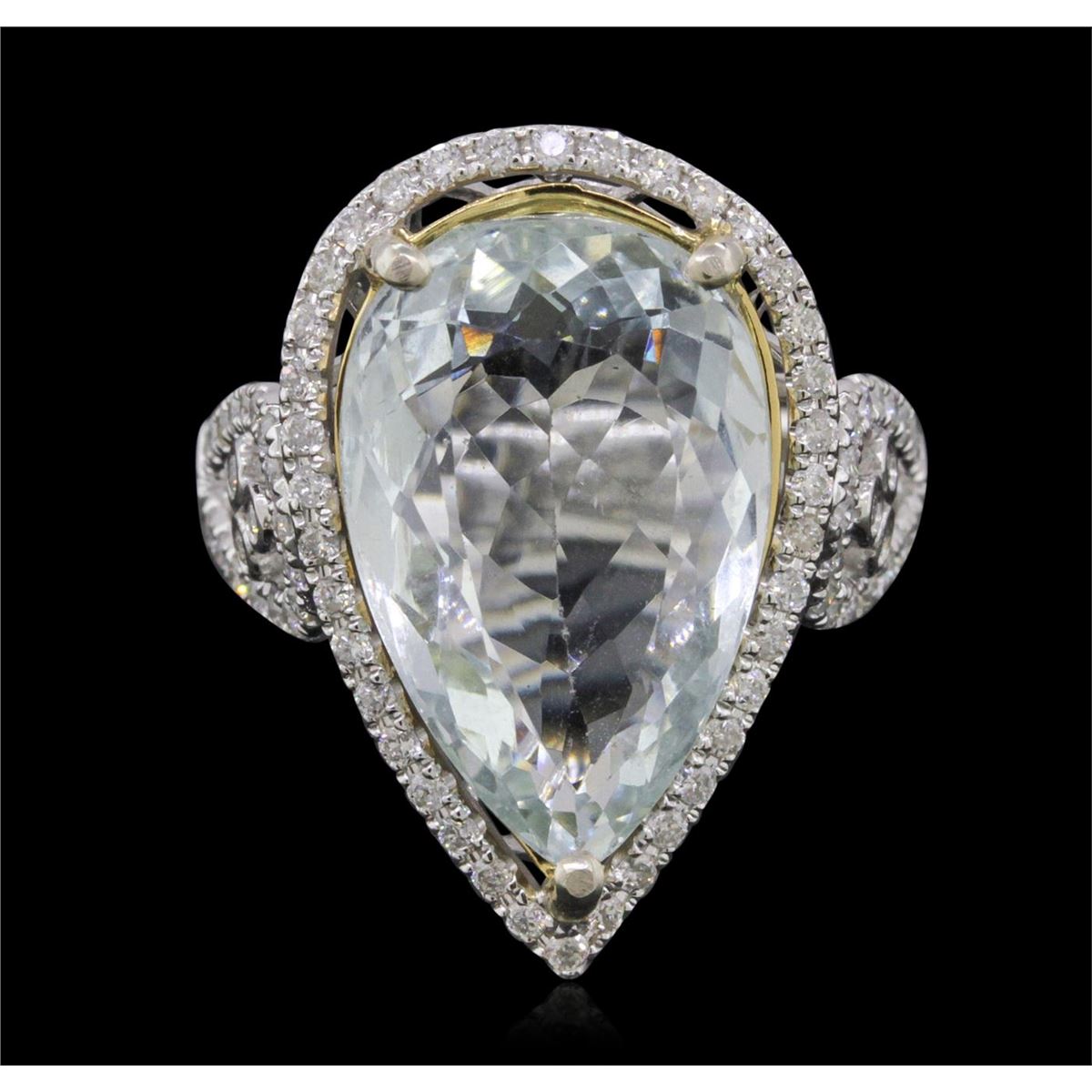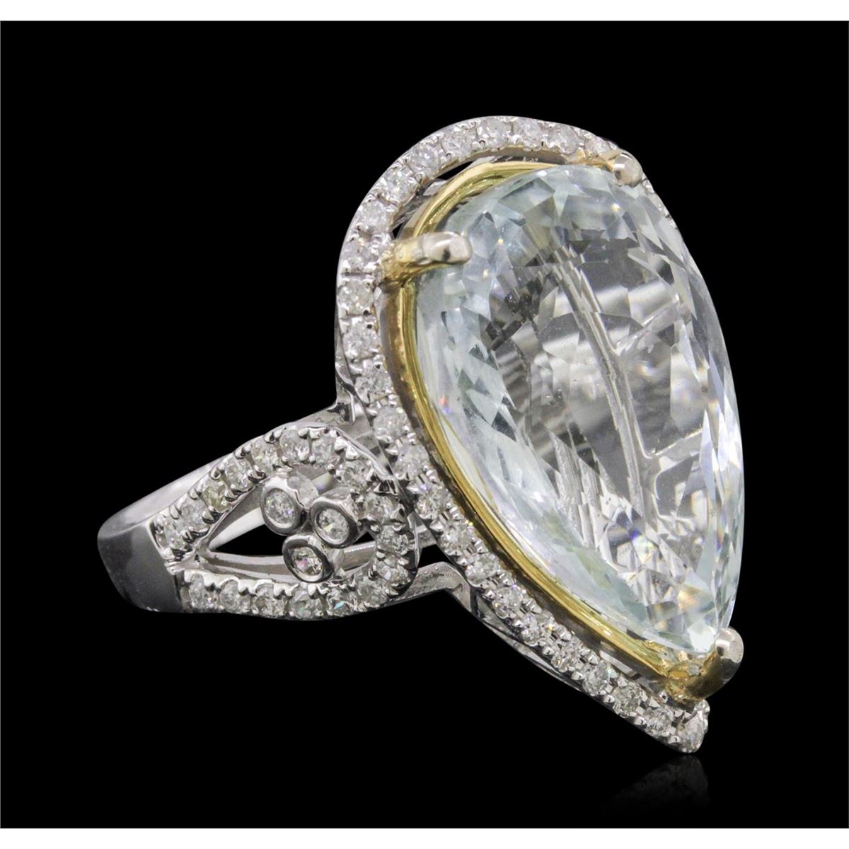 One electronically tested 14KT white and yellow gold ladies combination cast & assembled aquamarine and diamond ring with a split shank with a bright polish finish. Identified with markings of "14K". Condition is new. Containing: One prong set pear modified brilliant cut natural aquamarine, measuring 18.50 x 12.04 x 7.36mm, approximate weight of 8.92ct., clarity is eye clean, type I, light, very slightly grayish, blue color, (GIA B 3/3), cut is very good. Sixty-Eight prong set round brilliant cut diamonds, measuring 1.10 - 1.10 x 0.66mm (depth est.) approximate total weight of 68 Stones = 0.33ct. Clarity: I-1 to I-2. Color: I - J, Cut is Good. Colored gemstones are presumed to have been subjected to commonly used enhancement processes. All diamonds and colored gemstones are graded in the mounting, unless otherwise stated. Total Weight of Colored Stones 8.92ct. Total Weight of Diamonds 0.33ct. Total Weight of Ring 7.60 grams. GGL Appraised at $9,005.00.