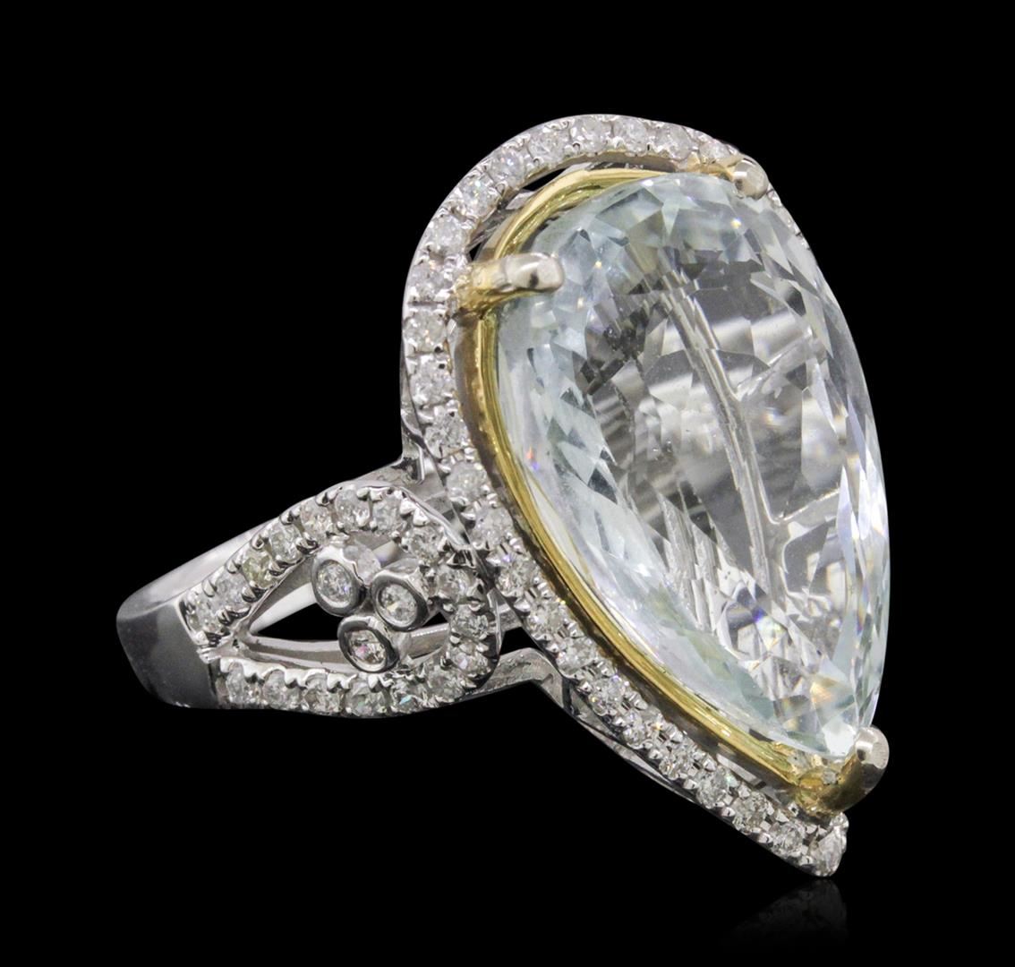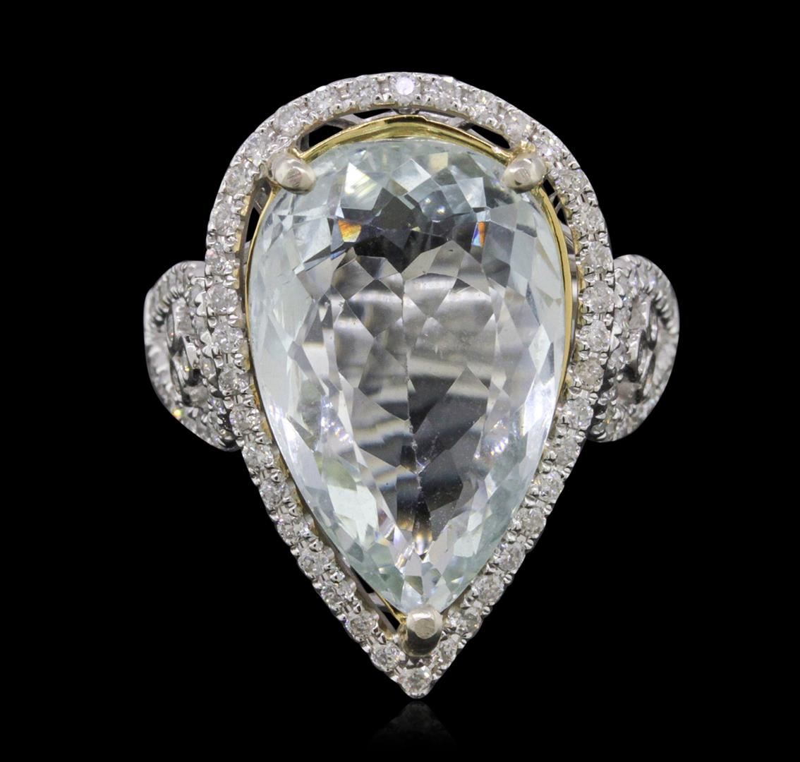 One electronically tested 14KT white and yellow gold ladies combination cast & assembled aquamarine and diamond ring with a split shank with a bright polish finish. Identified with markings of "14K". Condition is new. Containing: One prong set pear modified brilliant cut natural aquamarine, measuring 18.50 x 12.04 x 7.36mm, approximate weight of 8.92ct., clarity is eye clean, type I, light, very slightly grayish, blue color, (GIA B 3/3), cut is very good. Sixty-Eight prong set round brilliant cut diamonds, measuring 1.10 - 1.10 x 0.66mm (depth est.) approximate total weight of 68 Stones = 0.33ct. Clarity: I-1 to I-2. Color: I - J, Cut is Good. Colored gemstones are presumed to have been subjected to commonly used enhancement processes. All diamonds and colored gemstones are graded in the mounting, unless otherwise stated. Total Weight of Colored Stones 8.92ct. Total Weight of Diamonds 0.33ct. Total Weight of Ring 7.60 grams. GGL Appraised at $9,005.00.