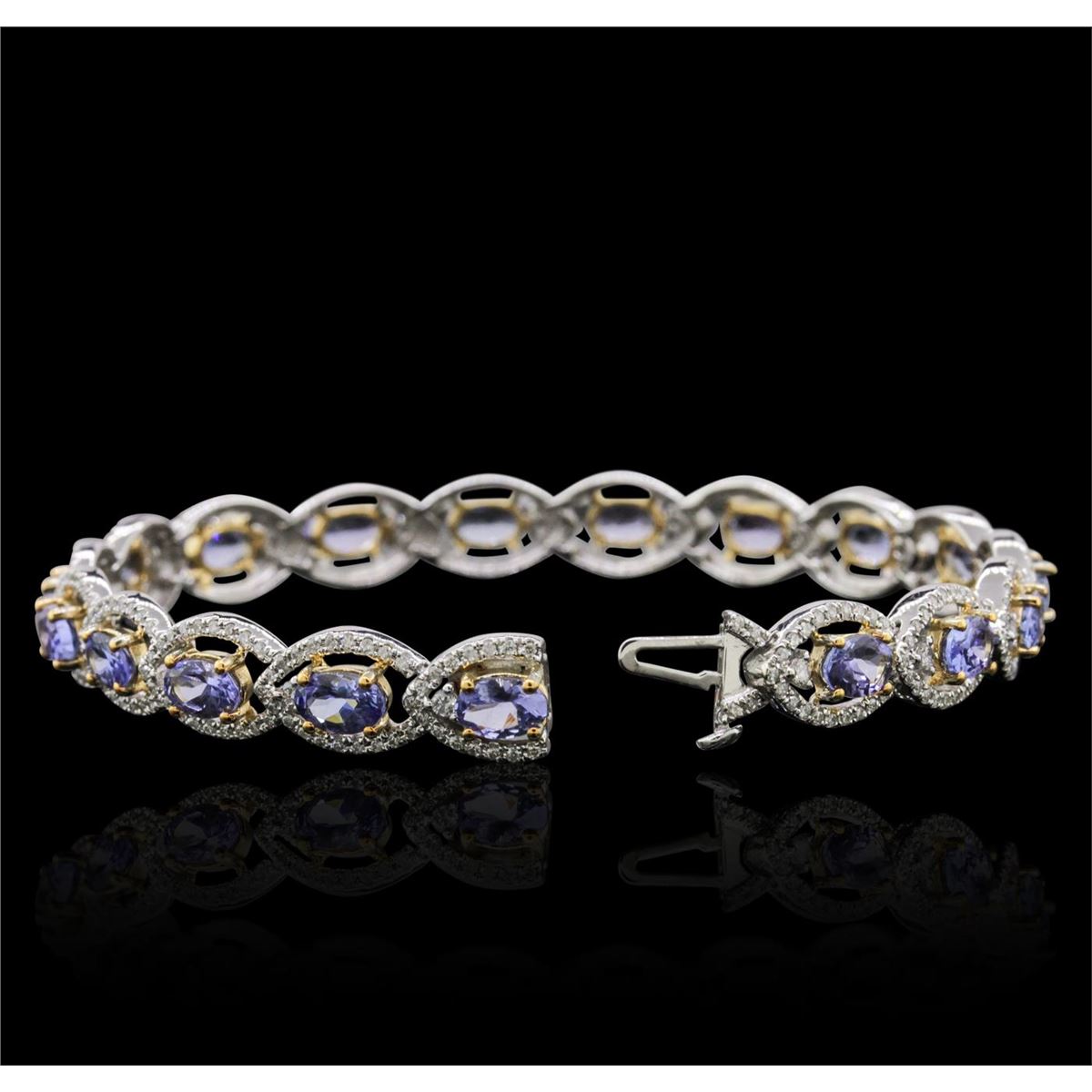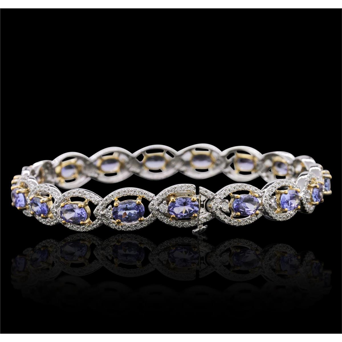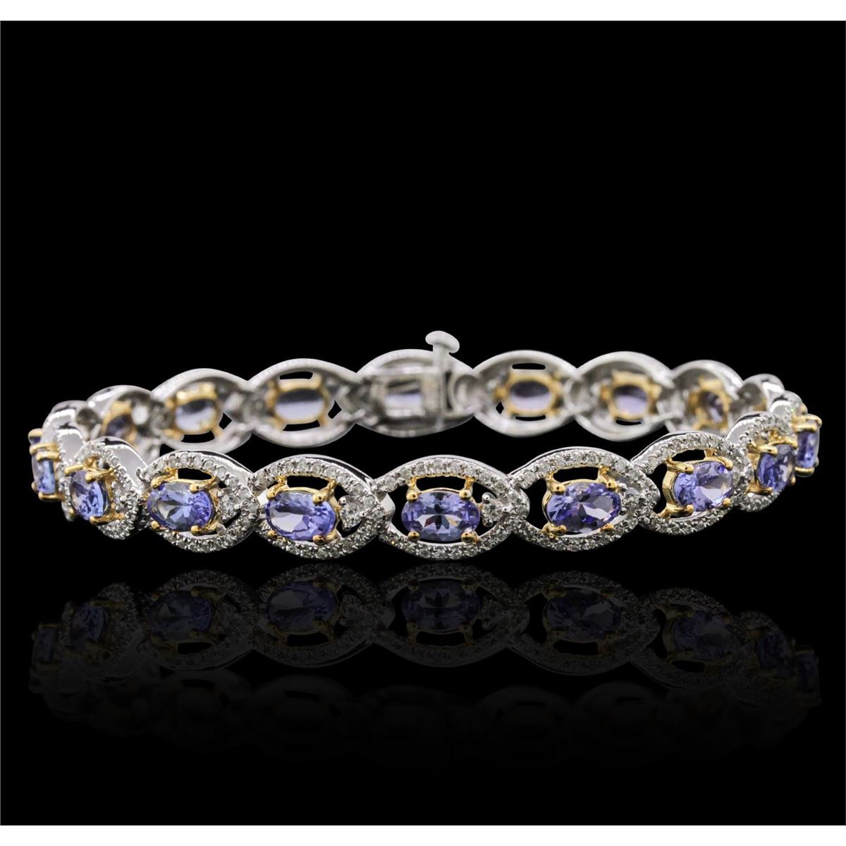 One electronically tested 14KT white and yellow gold ladies combination cast & assembled tanzanite and diamond bracelet with a hidden box clasp with a bright polish finish. Measurements: 7.25" in length. Condition is new. Containing: Eighteen prong set oval modified brilliant cut natural tanzanites, measuring 6.09 x 4.31 x 2.76mm, approximate total weight of 9.00ct., clarity is eye clean, type I, medium light, very slightly grayish, violet color, (GIA V 4/3), cut is very good. Eighteen prong set round brilliant cut diamonds, measuring 1.80 - 1.80 x 1.08mm (depth est.) approximate total weight of 18 Stones = 0.38ct. Clarity: SI-2 to I-1. Color: I - J, Cut is Good. Three Hundred Forty-Two prong set round brilliant cut diamonds, measuring 1.10 - 1.10 x 0.66mm (depth est.) approximate total weight of 342 Stones = 1.64ct. Clarity: I-1 to I-2. Color: I - J, Cut is Good. Colored gemstones are presumed to have been subjected to commonly used enhancement processes. All diamonds and colored gemstones are graded in the mounting, unless otherwise stated. Total Weight of Colored Stones 9.00ct. Total Weight of Diamonds 2.03ct. Total Weight of Bracelet 17.40 grams. GGL Appraised at $18,960.00.