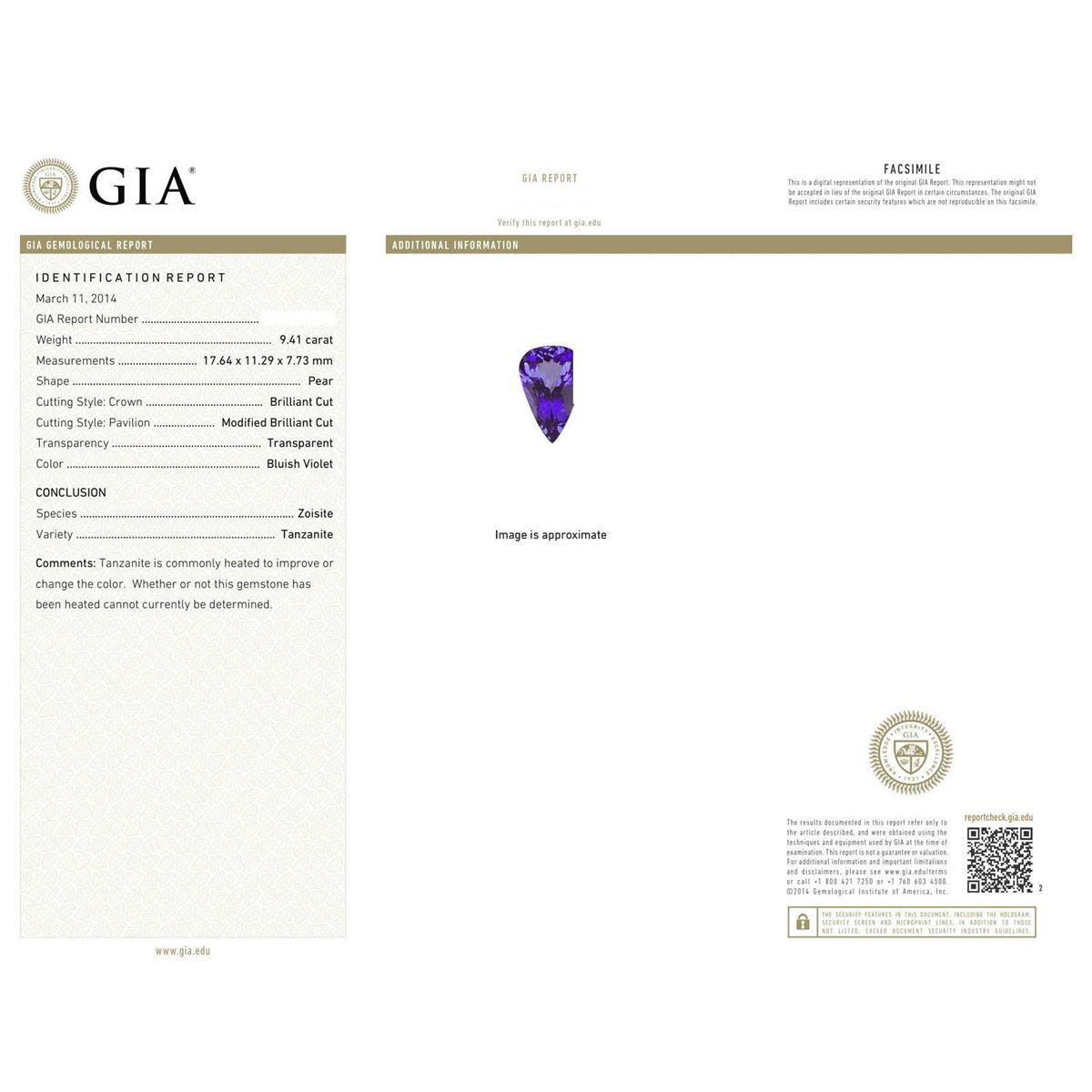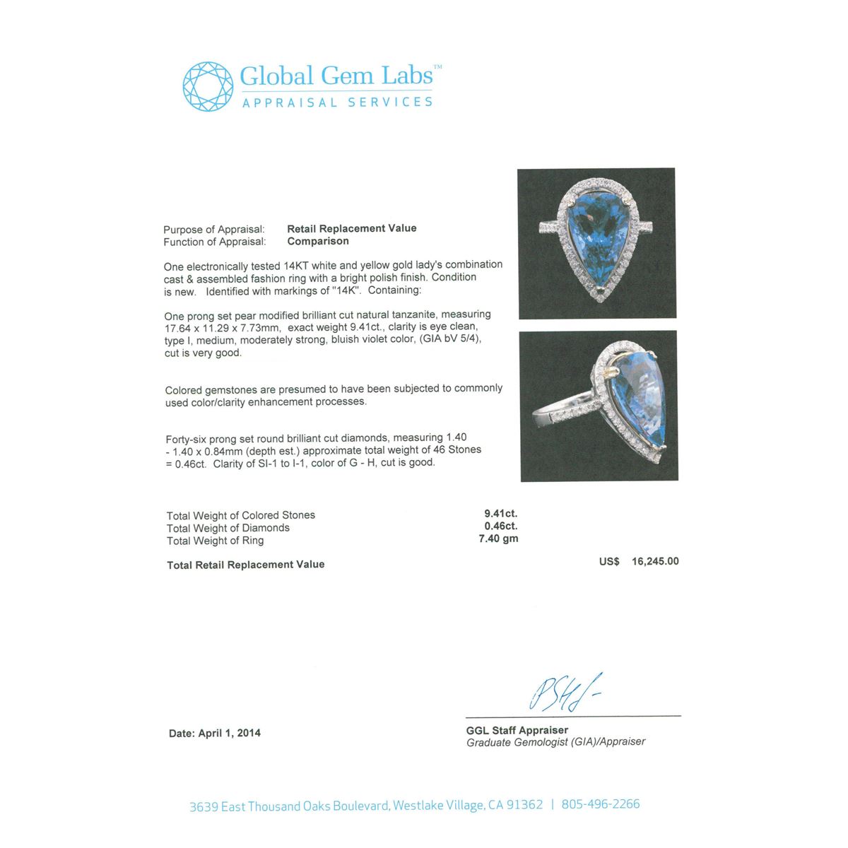 One electronically tested 14KT white and yellow gold Ladies combination cast & assembled fashion ring with a bright polish finish. Condition is new. Identified with markings of "14K". Containing: One prong set pear modified brilliant cut natural tanzanite, measuring 17.64 x 11.29 x 7.73mm, exact weight 9.41ct., clarity is eye clean, type I, medium, moderately strong, bluish violet color, (GIA bV 5/4), cut is very good. GIA Report: #1156951639.Colored gemstones are presumed to have been subjected to commonly used color/clarity enhancement processes. Forty-Six prong set round brilliant cut diamonds, measuring 1.40 - 1.40 x 0.84mm (depth est.) approximate. Total Weight of 46 Stones = 0.46ct. Clarity: SI-1 to I-1. Color: G - H, Cut is Good. Total Weight of Colored Stones 9.41ct. Total Weight of Diamonds 0.46ct. Total Weight of Ring 7.40 grams. GGL Appraised at $16,245.00.