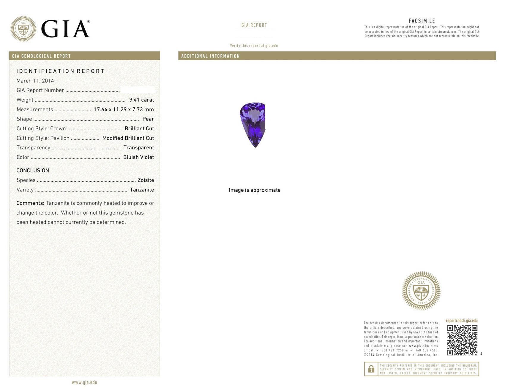 One electronically tested 14KT white and yellow gold Ladies combination cast & assembled fashion ring with a bright polish finish. Condition is new. Identified with markings of "14K". Containing: One prong set pear modified brilliant cut natural tanzanite, measuring 17.64 x 11.29 x 7.73mm, exact weight 9.41ct., clarity is eye clean, type I, medium, moderately strong, bluish violet color, (GIA bV 5/4), cut is very good. GIA Report: #1156951639.Colored gemstones are presumed to have been subjected to commonly used color/clarity enhancement processes. Forty-Six prong set round brilliant cut diamonds, measuring 1.40 - 1.40 x 0.84mm (depth est.) approximate. Total Weight of 46 Stones = 0.46ct. Clarity: SI-1 to I-1. Color: G - H, Cut is Good. Total Weight of Colored Stones 9.41ct. Total Weight of Diamonds 0.46ct. Total Weight of Ring 7.40 grams. GGL Appraised at $16,245.00.
