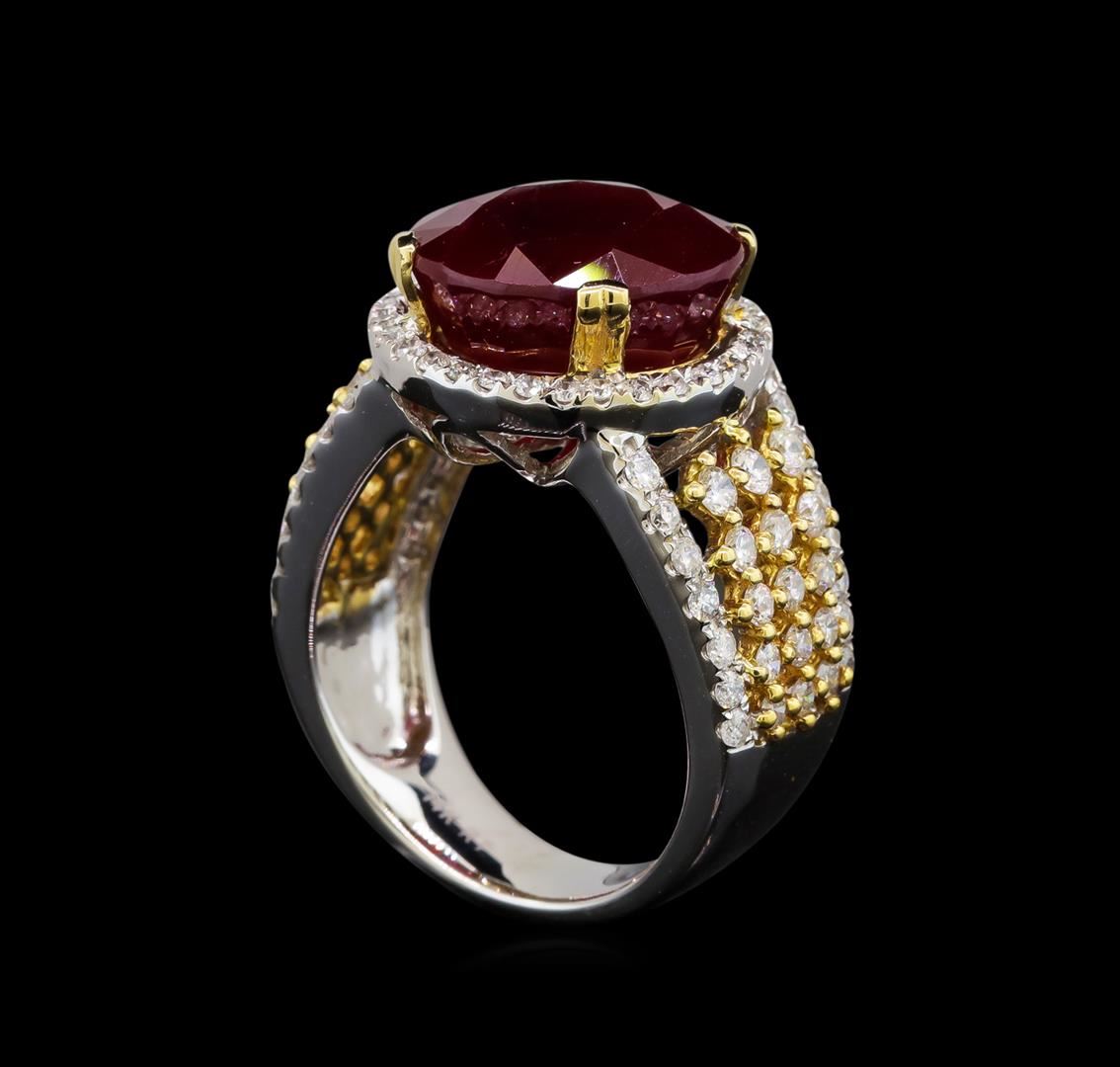 One electronically tested 14KT white and yellow gold ladies cast ruby and diamond ring with a bright polish finish. Identified with markings of "14K". Condition is new. Containing: One prong set round modified brilliant cut natural ruby, measuring 13.00. - 13.00. x 8.45 mm, approximate weight of 9.57ct., clarity is heavily included, type II, medium dark, moderately strong, strongly purplish red color, (GIA stpR 6/4), cut is good. Eighty-Eight prong set round brilliant cut diamonds, measuring 2.00. - 1.30 x 0.99mm (depth est.) approximate total weight of 88 Stones = 1.36ct. Clarity: SI-2 to I-1. Color: J - K. All diamonds and colored gemstones are graded in the mounting, unless otherwise stated. Colored gemstones are presumed to have been subjected to commonly used enhancement processes.. Total Weight of Colored Stones 9.57ct. Total Weight of Diamonds 1.36ct. Total Weight of Ring 11.10 grams. GGL Appraised at $4,655.00.