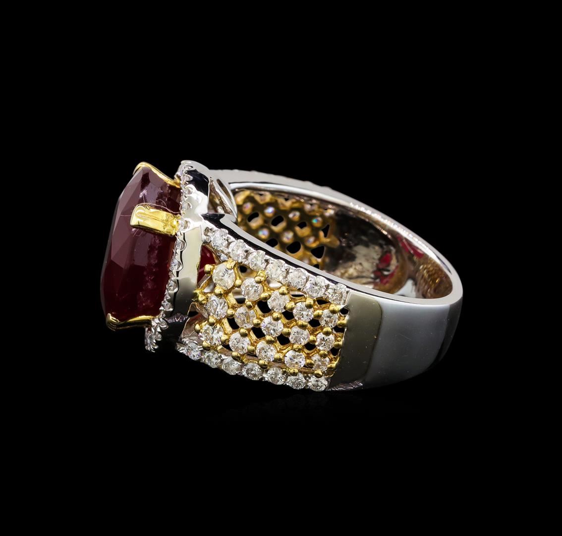 One electronically tested 14KT white and yellow gold ladies cast ruby and diamond ring with a bright polish finish. Identified with markings of "14K". Condition is new. Containing: One prong set round modified brilliant cut natural ruby, measuring 13.00. - 13.00. x 8.45 mm, approximate weight of 9.57ct., clarity is heavily included, type II, medium dark, moderately strong, strongly purplish red color, (GIA stpR 6/4), cut is good. Eighty-Eight prong set round brilliant cut diamonds, measuring 2.00. - 1.30 x 0.99mm (depth est.) approximate total weight of 88 Stones = 1.36ct. Clarity: SI-2 to I-1. Color: J - K. All diamonds and colored gemstones are graded in the mounting, unless otherwise stated. Colored gemstones are presumed to have been subjected to commonly used enhancement processes.. Total Weight of Colored Stones 9.57ct. Total Weight of Diamonds 1.36ct. Total Weight of Ring 11.10 grams. GGL Appraised at $4,655.00.