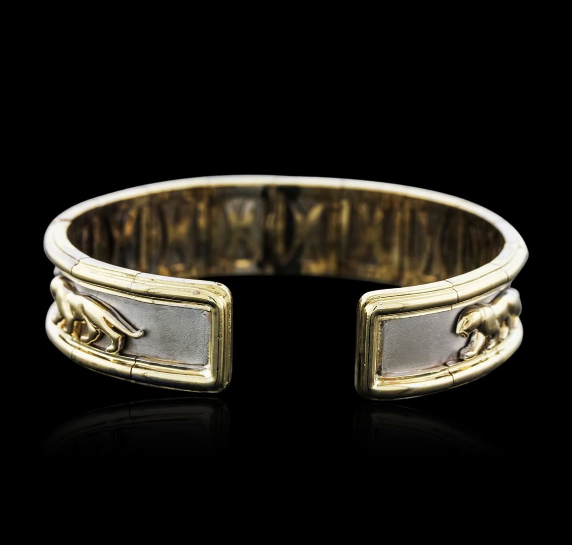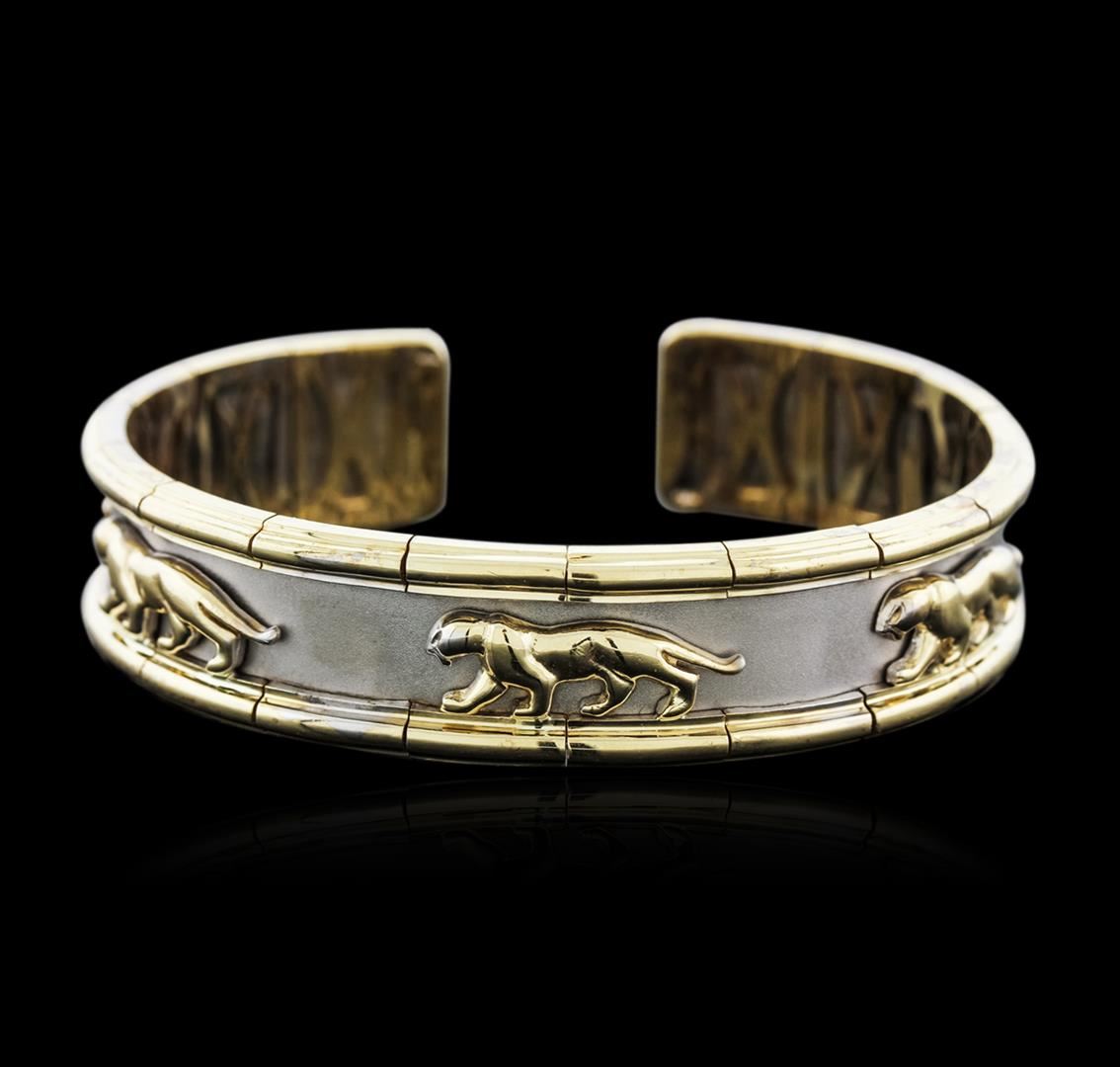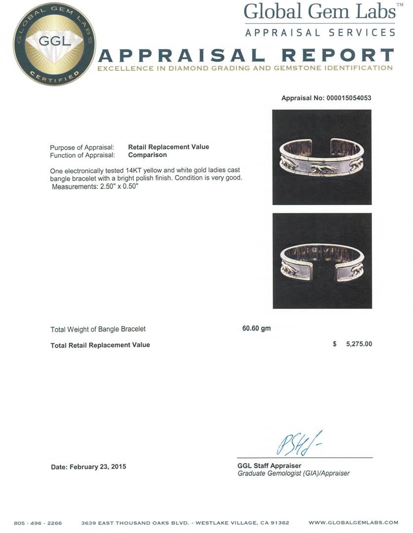 One electronically tested 14KT yellow and white gold ladies cast bangle bracelet with a bright polish finish. Measurements: 2.50" x 0.50" Condition is very good. Total Weight of Bangle Bracelet 60.60 grams. GGL Appraised at $5,275.00.