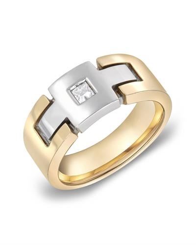 One 14KT Two Tone Gold Diamond Ring. (1) Princess cut Diamond with a total weight of 0.16cts with a color of I and clarity of I-1. Total weight of this ring is 11.69 grams.