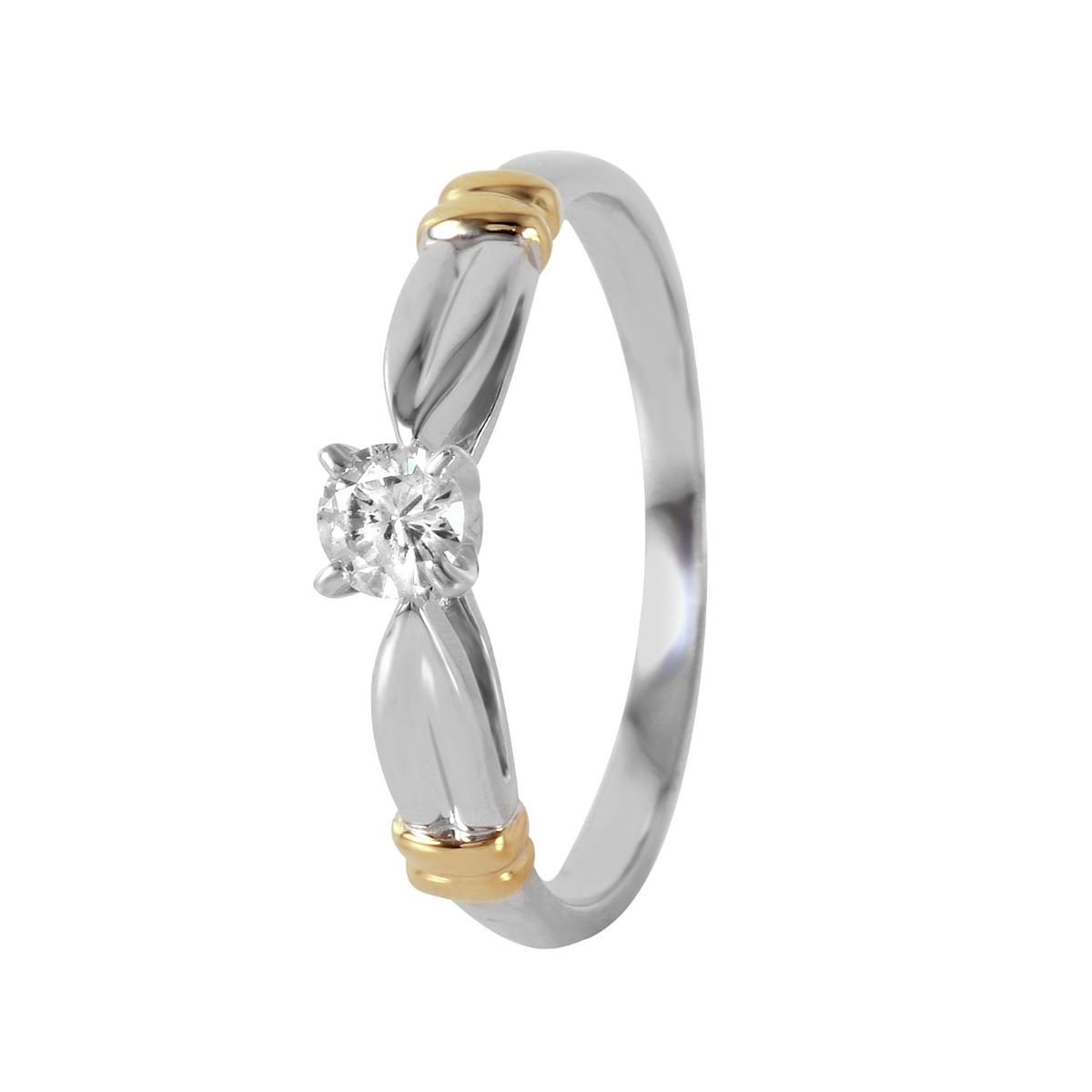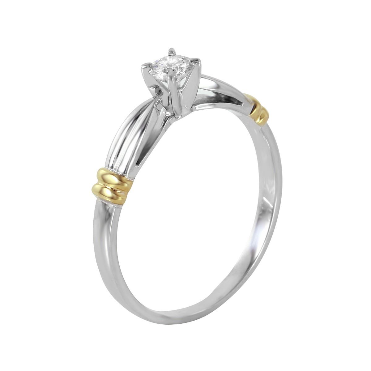 This engagement ring features one round brilliant cut prong set diamond with two yellow gold ribbon accents on the top, all on a brightly polished 14KT white gold scalloped design band.SpecificationsJewelry InformationCategory: RingCategory Style: SolitaireNew/Used: Pre-OwnedGender: FemaleRing Size: 7Metal: 14KT Yellow and White GoldTotal Weight: 2.14 GramsTotal Diamond Weight: 0.20ctwTotal Weight all Stones: 0.2ctwInternal ID:6652Diamond 1Total Carat Weight: 0.20ctwShape: Round Brilliant CutCount: 1DisclaimersThe descriptions listed should not be construed as an appraisal. The detail is provided as a guideline for color, clarity, weights and measurements to the best of our ability. We welcome inspections. WE SHIP WORLDWIDE!This item has a Reserve established by our consigner.