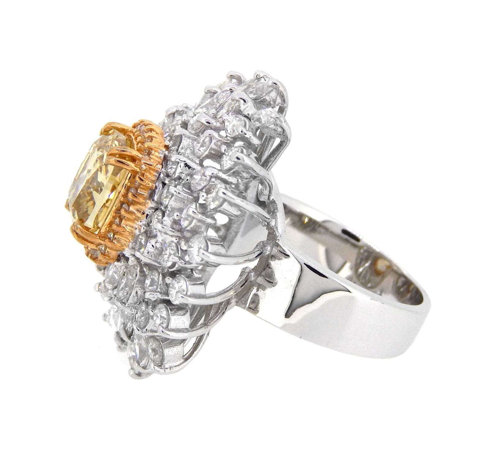 One 14KT Two Tone Gold Fancy Brownish Yellow 9.52ctw Diamond Ring. (1) Cushion cut Fancy Brownish Yellow Diamond with a total weight of 5.02cts with a clarity of SI-2. (80) Diamonds with a total weight of 4.50cts with a color of G-H and clarity of VS-1 to SI-1. Total weight of this ring is 19.2 grams.