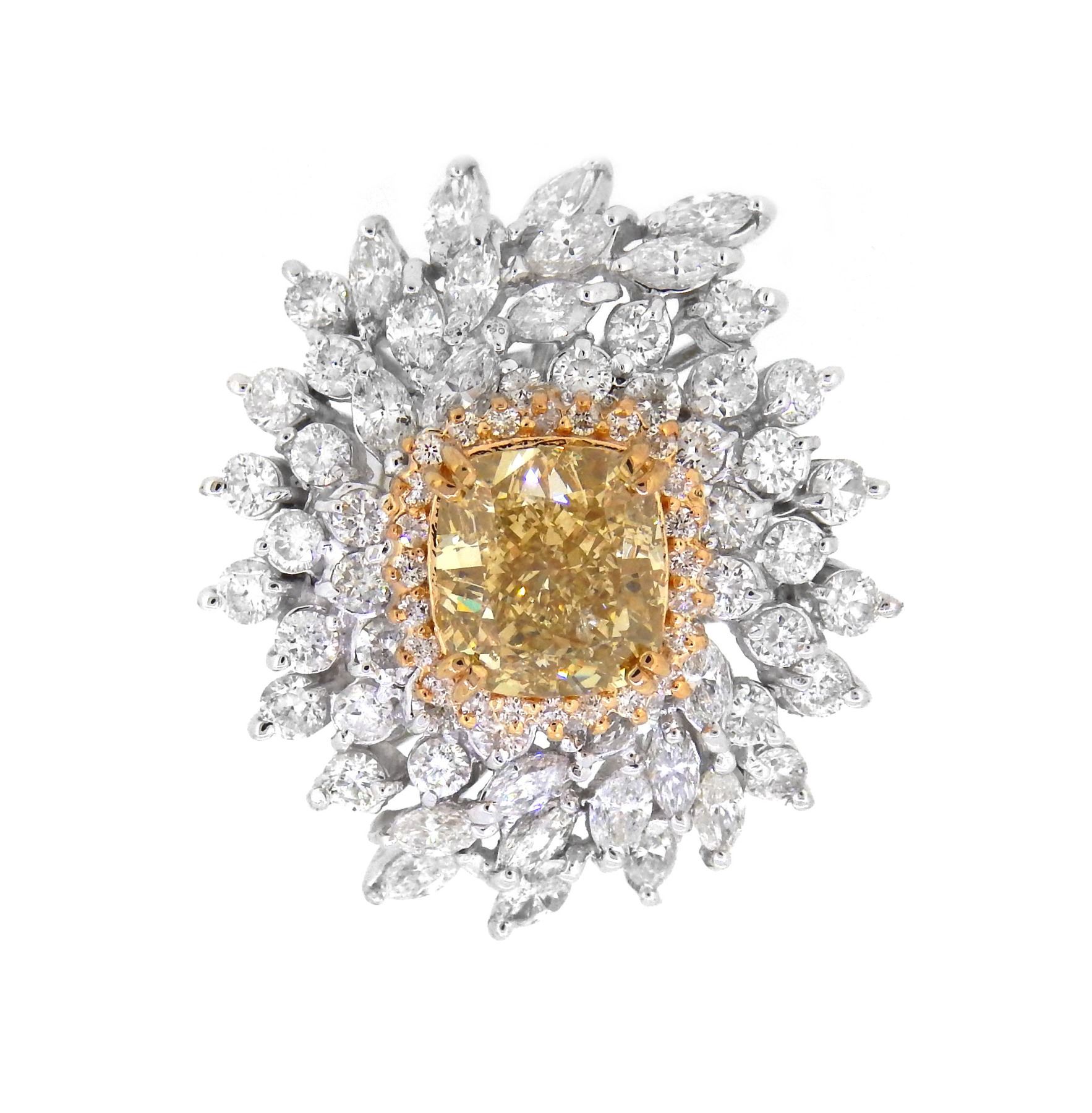 One 14KT Two Tone Gold Fancy Brownish Yellow 9.52ctw Diamond Ring. (1) Cushion cut Fancy Brownish Yellow Diamond with a total weight of 5.02cts with a clarity of SI-2. (80) Diamonds with a total weight of 4.50cts with a color of G-H and clarity of VS-1 to SI-1. Total weight of this ring is 19.2 grams.