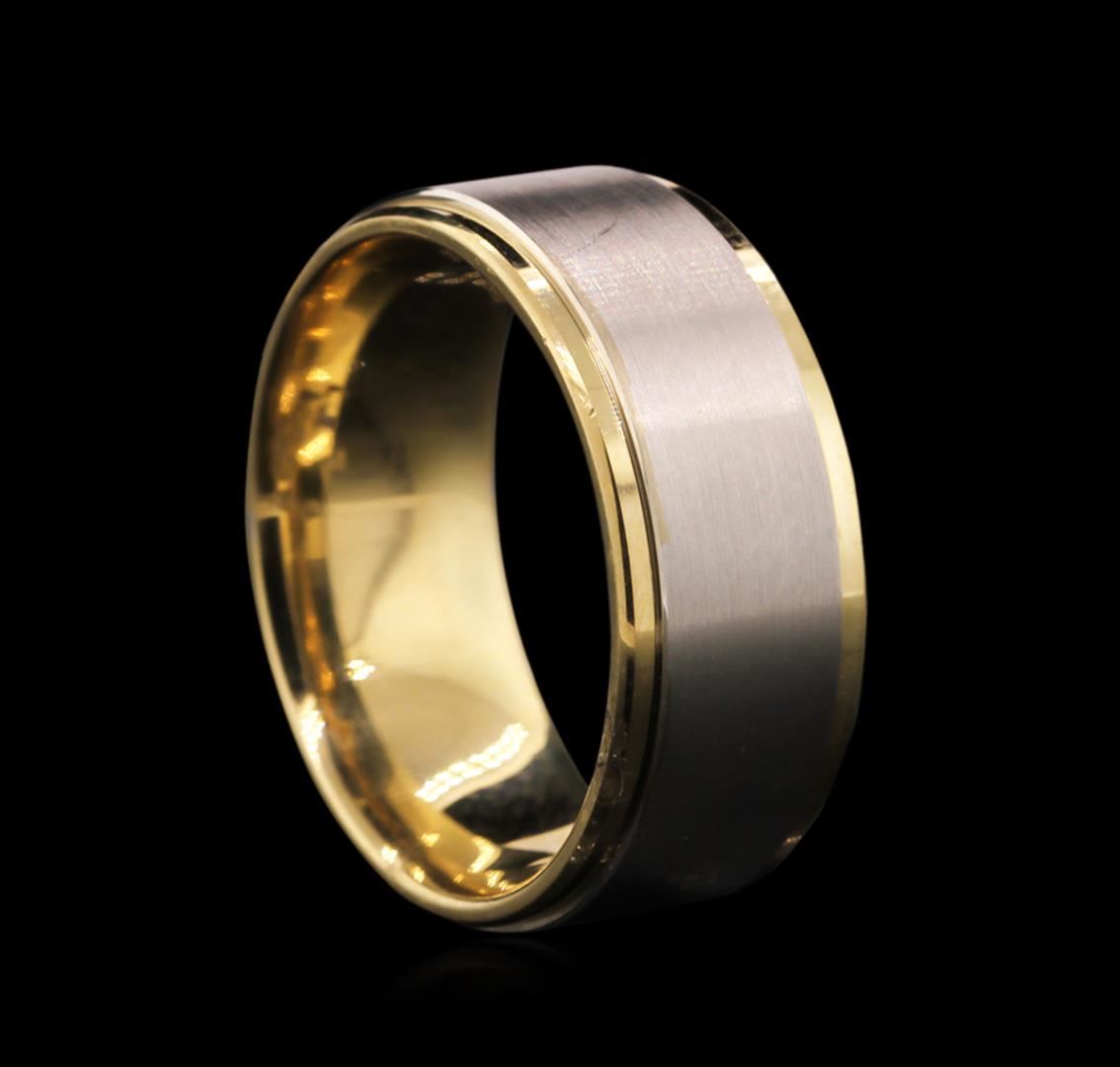One ring featuring: 14KT yellow and white gold weighing 10.03 grams. Comfort fit, brushed 8mm band. Beautiful and simple mens ring with bevel edges.