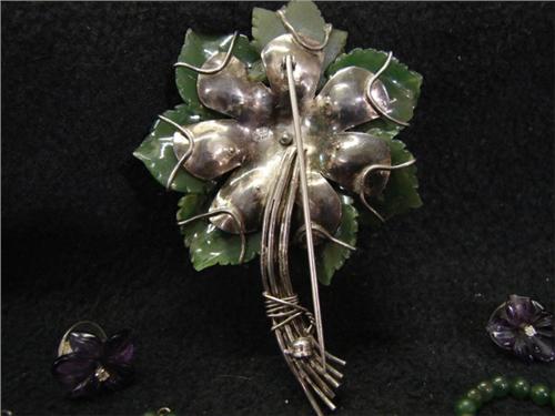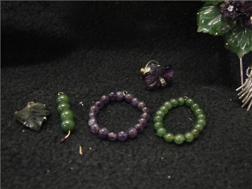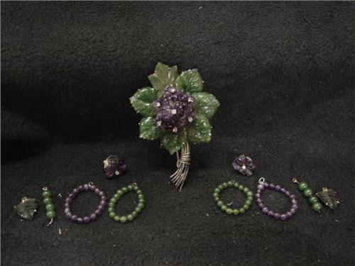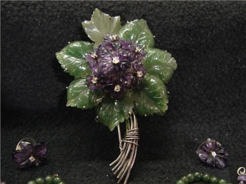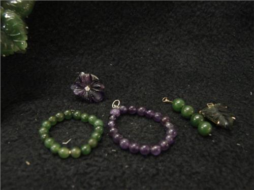 14KT WHITE GOLD AMETHYST PEARL ENHANCER & EARRINGS. Consists of 14KT white gold and amethyst pearl enhancer with green and white cubic zirconia and a pair of 14KT earrings with carved amethyst & jade with clear stones. Earrings have jade jacket attachments, amethyst jacket attachments, and leaf attachments.