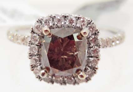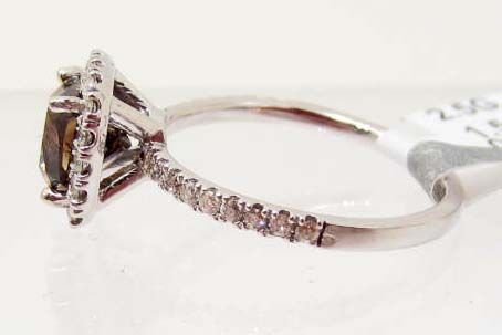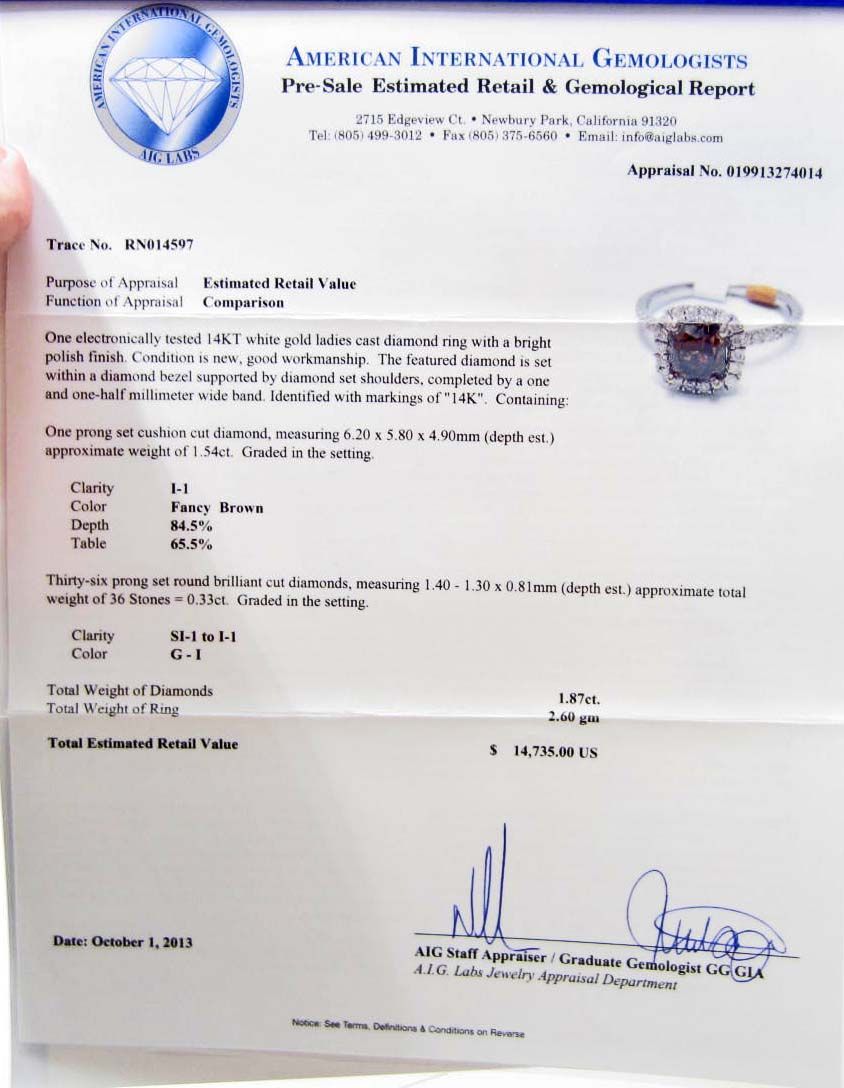 One prong set cushion cut Fancy Brown Diamond center stone 1.54 cts. 36 prong set round brilliant cut Diamonds 0.33 cts. Total Weight 2.60 grams. Appraised Value $14,735.00
