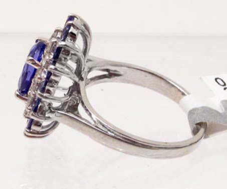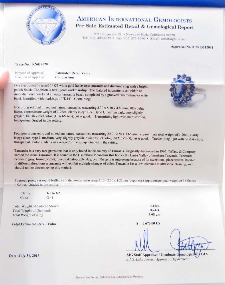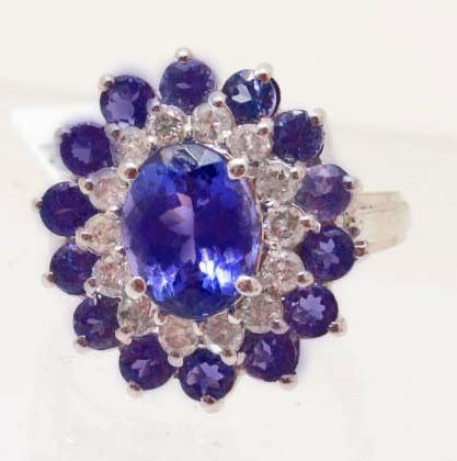 One prong set oval mixed cut natural Tanzanite center stone 1.96 cts. 14 prong set round mixed cut natural Tanzanites 1.20 cts. 14 prong set round brilliant cut Diamonds 0.44 cts. Total Weight 5.08 grams. Appraised Value $6,670.00
