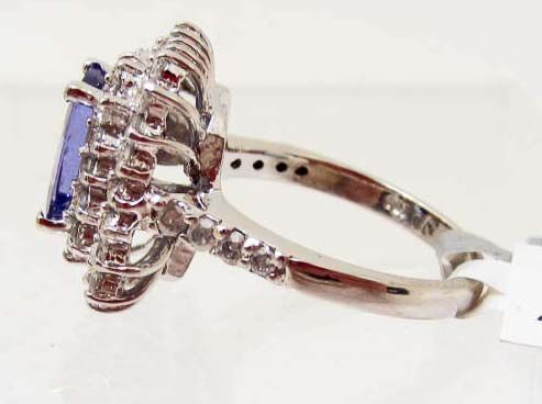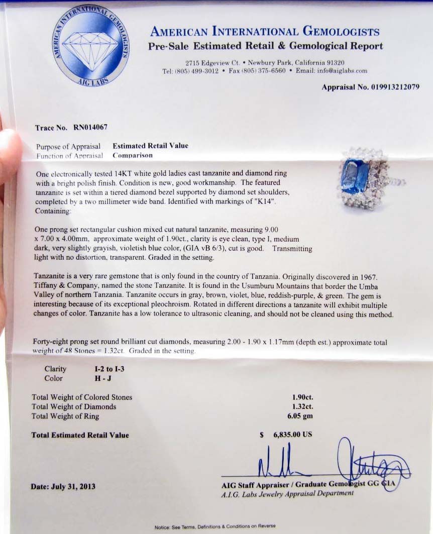 One prong set rectangular cushion mixed cut natural Tanzanite center stone 1.90 cts. 48 prong set round brilliant cut Diamonds 1.32 cts. Total Weight 6.05 grams. Appraised Value $6,835.00.