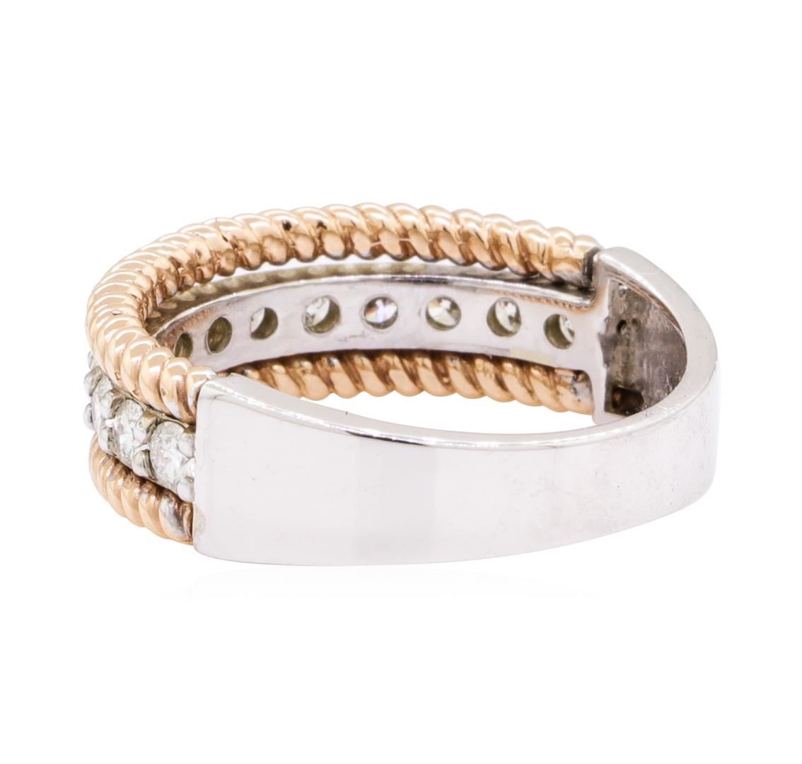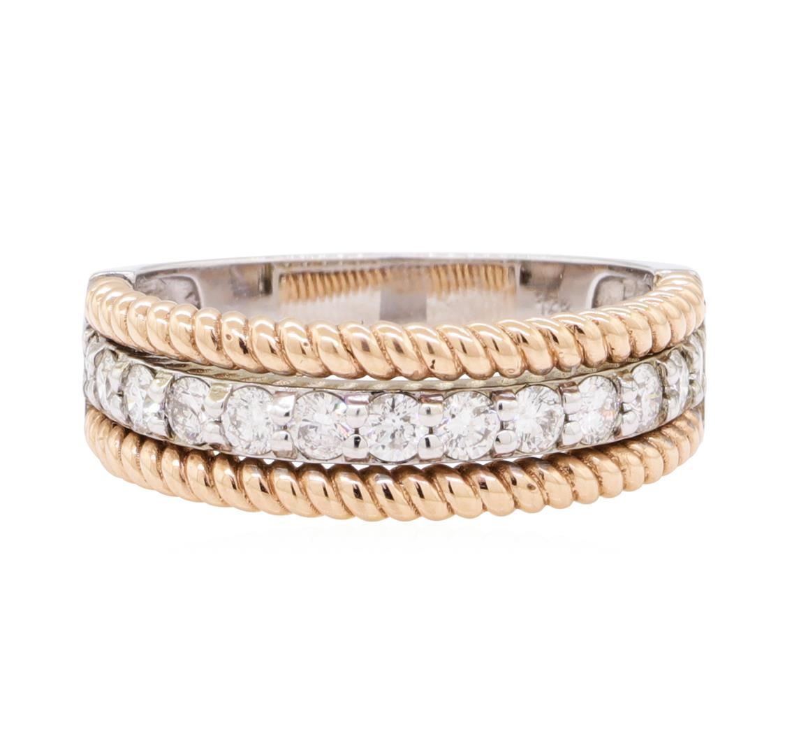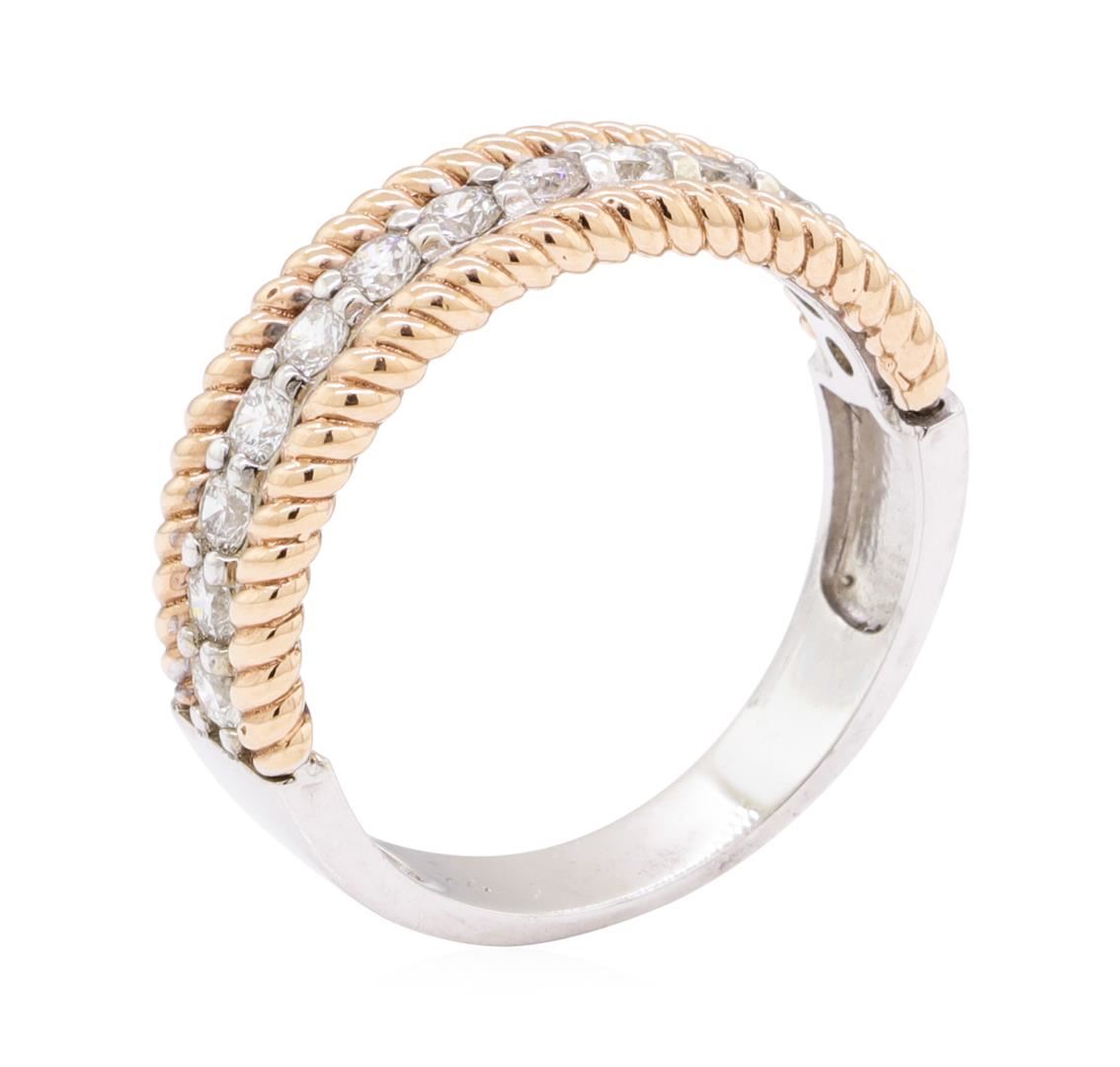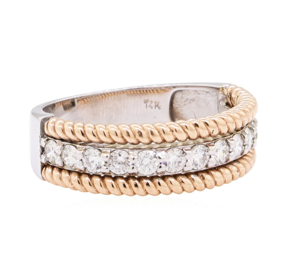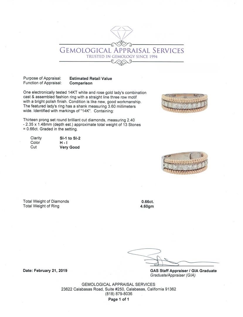 One electronically tested 14KT white and rose gold lady's combination cast & assembled fashion ring with a straight line three row motif with a bright polish finish. The featured lady's ring has a shank measuring 3.60 millimeters wide. Identified with markings of '14K'. Condition is like new, good workmanship. Containing: Thirteen prong set round brilliant cut diamonds, measuring 2.40 - 2.35 x 1.48mm (depth est.) approximate total weight of 13 Stones = 0.66ct. Graded in the setting. Color H - I, Clarity SI-1 to SI-2, Cut Very Good. Total Weight of Diamonds 0.66ct. Total Weight of Ring 4.60gm. GAS Appraised.