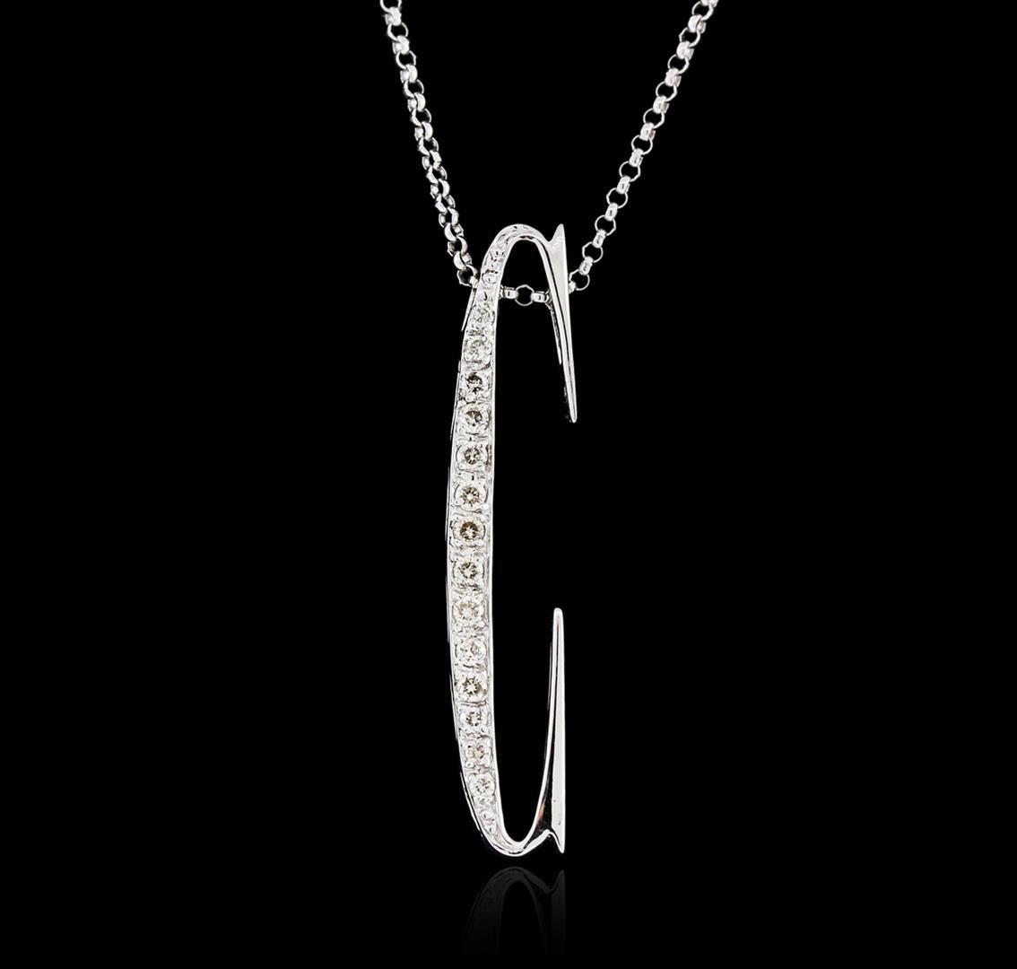 One pendant with chain resembling the letter C featuring: 14KT white gold weighing 3.10 grams containing diamonds with a total weight of 0.18ct.