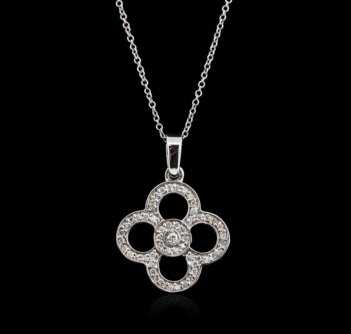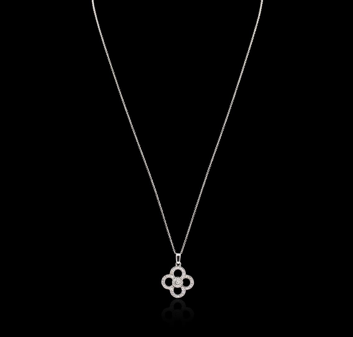 One electronically tested 14KT white gold ladies cast diamond pendant & chain 18.0" long, with a spring ring clasp with a bright polish finish. Identified with markings of "14K". Condition is new. Containing: Fifty-Five prong set round brilliant cut diamonds, measuring 1.80 - 1.00 x 0.84mm (depth est.) approximate total weight of 55 Stones = 0.20ct. Clarity: SI-1 to I-1. Color: I - J, Cut is Good. All diamonds are graded in the mounting, unless otherwise stated. Total Weight of Diamonds 0.20ct. Total Weight of Pendant & Chain 3.00 grams. GGL Appraised at $1,000.00.