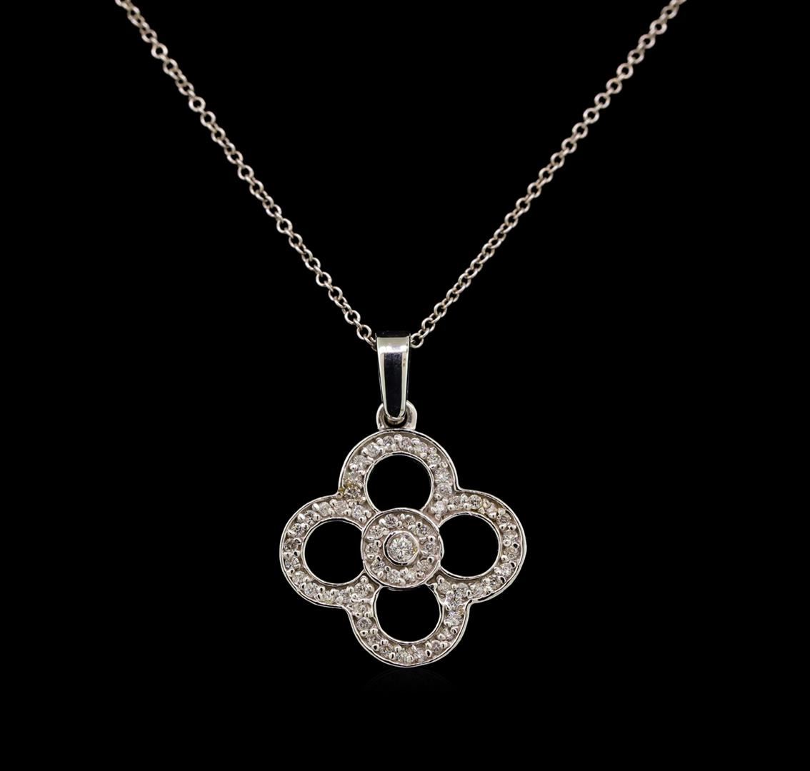 One electronically tested 14KT white gold ladies cast diamond pendant & chain 18.0" long, with a spring ring clasp with a bright polish finish. Identified with markings of "14K". Condition is new. Containing: Fifty-Five prong set round brilliant cut diamonds, measuring 1.80 - 1.00 x 0.84mm (depth est.) approximate total weight of 55 Stones = 0.20ct. Clarity: SI-1 to I-1. Color: I - J, Cut is Good. All diamonds are graded in the mounting, unless otherwise stated. Total Weight of Diamonds 0.20ct. Total Weight of Pendant & Chain 3.00 grams. GGL Appraised at $1,000.00.