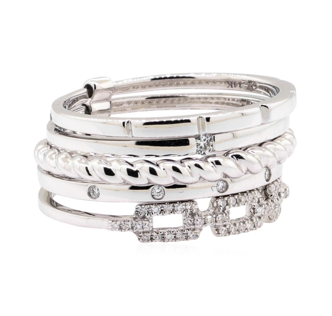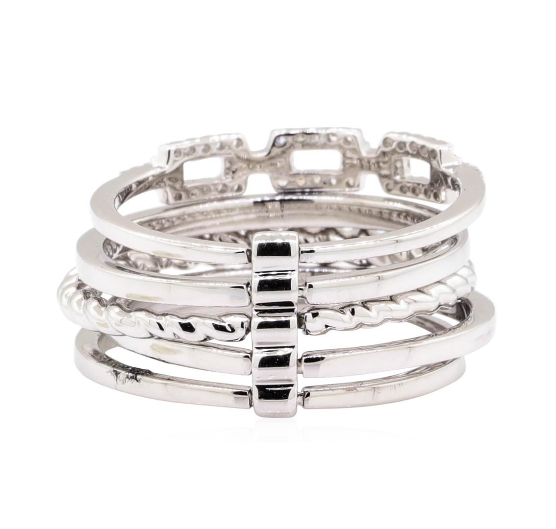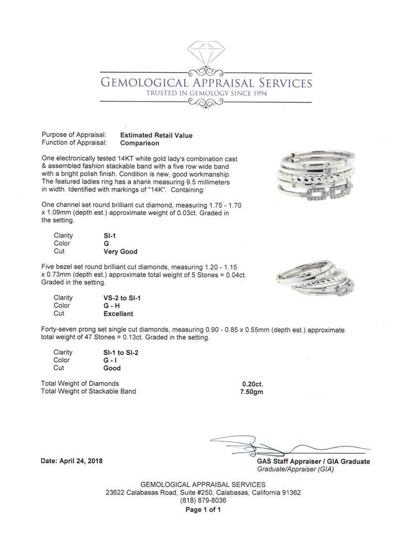 One electronically tested 14KT white gold Ladies combination cast & assembled fashion stackable band with a five row wide band with a bright polish finish. The featured ladies ring has a shank measuring 9.5 millimeters in width. Identified with markings of '14K'. Condition is new, good workmanship. Containing: One channel set round brilliant cut diamond, measuring 1.75 - 1.70 x 1.09mm (depth est.) approximate weight of 0.03ct. Graded in the setting. Color G Clarity SI-1 Cut Very Good Five bezel set round brilliant cut diamonds, measuring 1.20 - 1.15 x 0.73mm (depth est.) approximate total weight of 5 Stones = 0.04ct. Graded in the setting. Color G - H Clarity VS-2 to SI-1 Cut Excellent Forty-Seven prong set single cut diamonds, measuring 0.90 - 0.85 x 0.55mm (depth est.) approximate total weight of 47 Stones = 0.13ct. Graded in the setting. Color G - I Clarity SI-1 to SI-2 Cut Good. Total Weight of Diamonds 0.20ct.. Total Weight of Stackable Band 7.50gm. GAS Appraised.