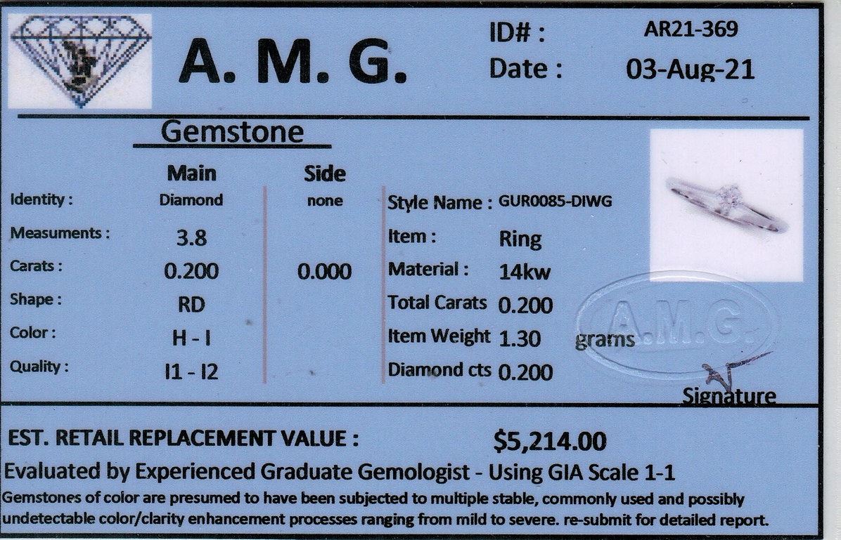 (1) round Diamond with a total weight of 0.20cts with a color of H-I and clarity of I1-I2. Total weight of this ring is 1.3 grams. Ring size is 7.5.