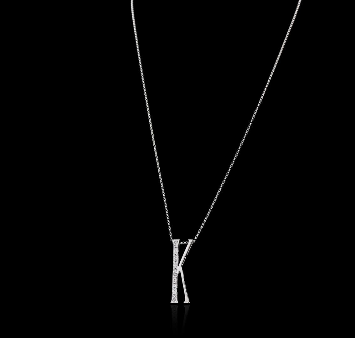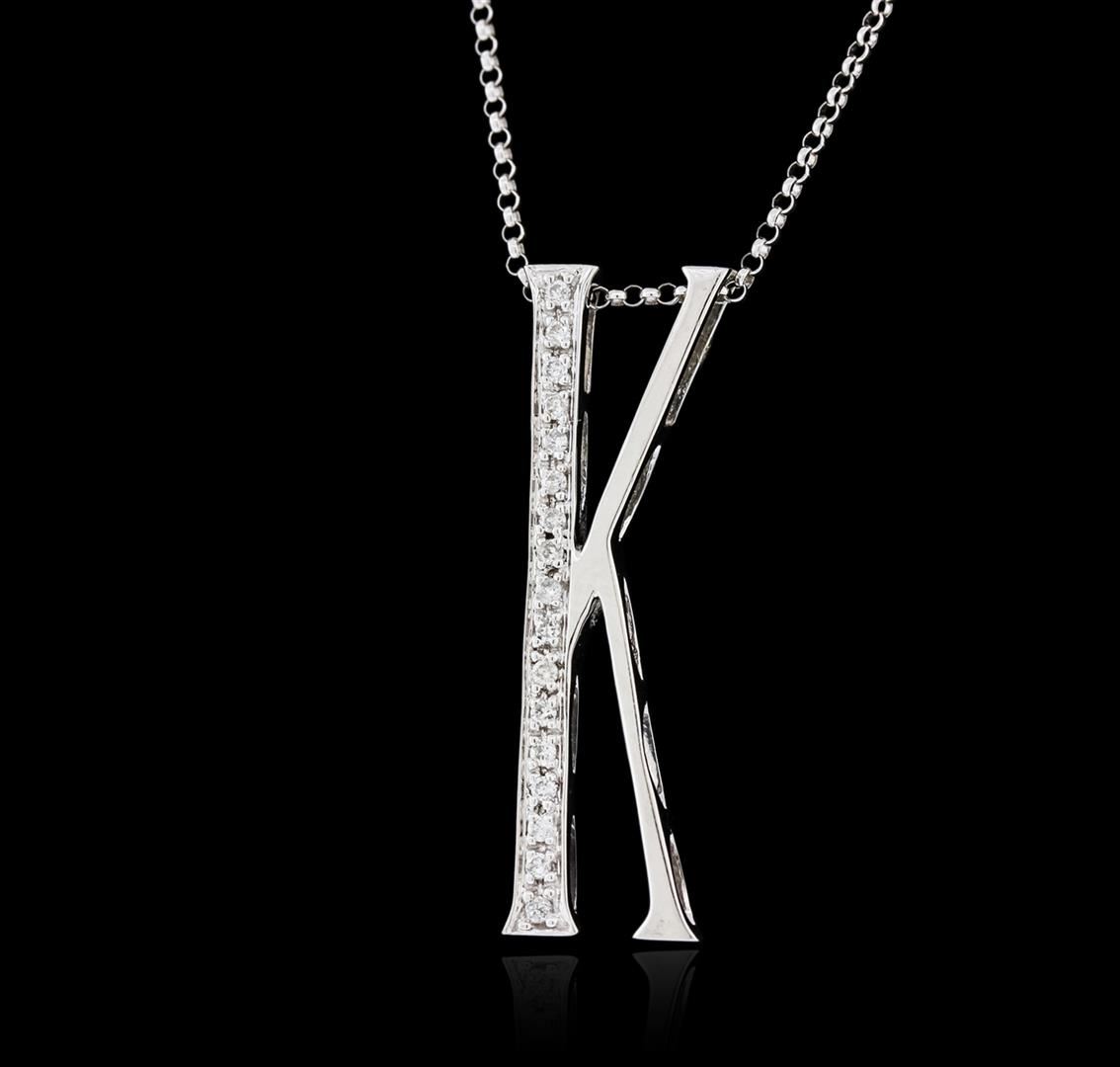 One pendant with chain resembling the letter K featuring: 14KT white gold weighing 4.10 grams containing diamonds with a total weight of 0.21ct.