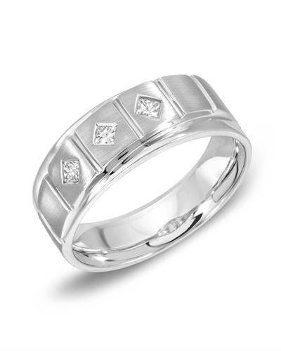 One 14KT White Gold 0.23ctw Diamond Ring. (3) princess cut Diamonds with a total weight of 0.23cts with a color of G-H and clarity of SI-2. Ring size is 10. Total weight of this ring is 8.29 grams.