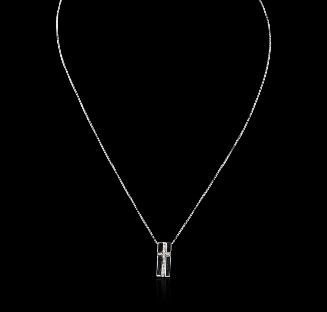 One pendant with chain featuring: 14KT white gold weighing 4.90 grams containing round diamonds with a total weight of 0.25ct.