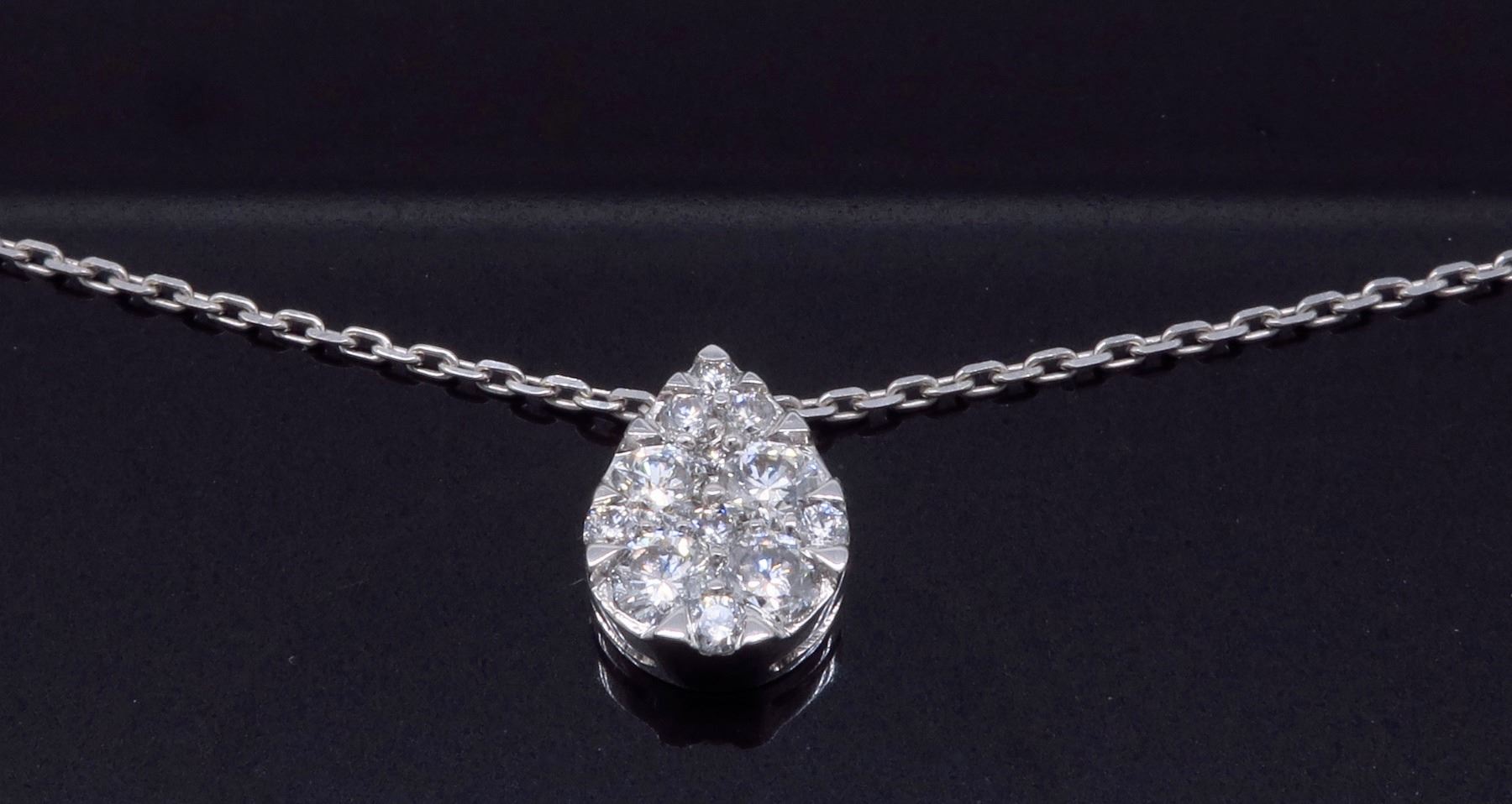 One 14KT White Gold 0.25ctw Diamond Pendant with Chain. Round Diamonds with a total weight of 0.25cts with a color of G and clarity of SI-2. Total weight of this pendant with chain is 1.66 grams. Total length of this chain is 17 inches.