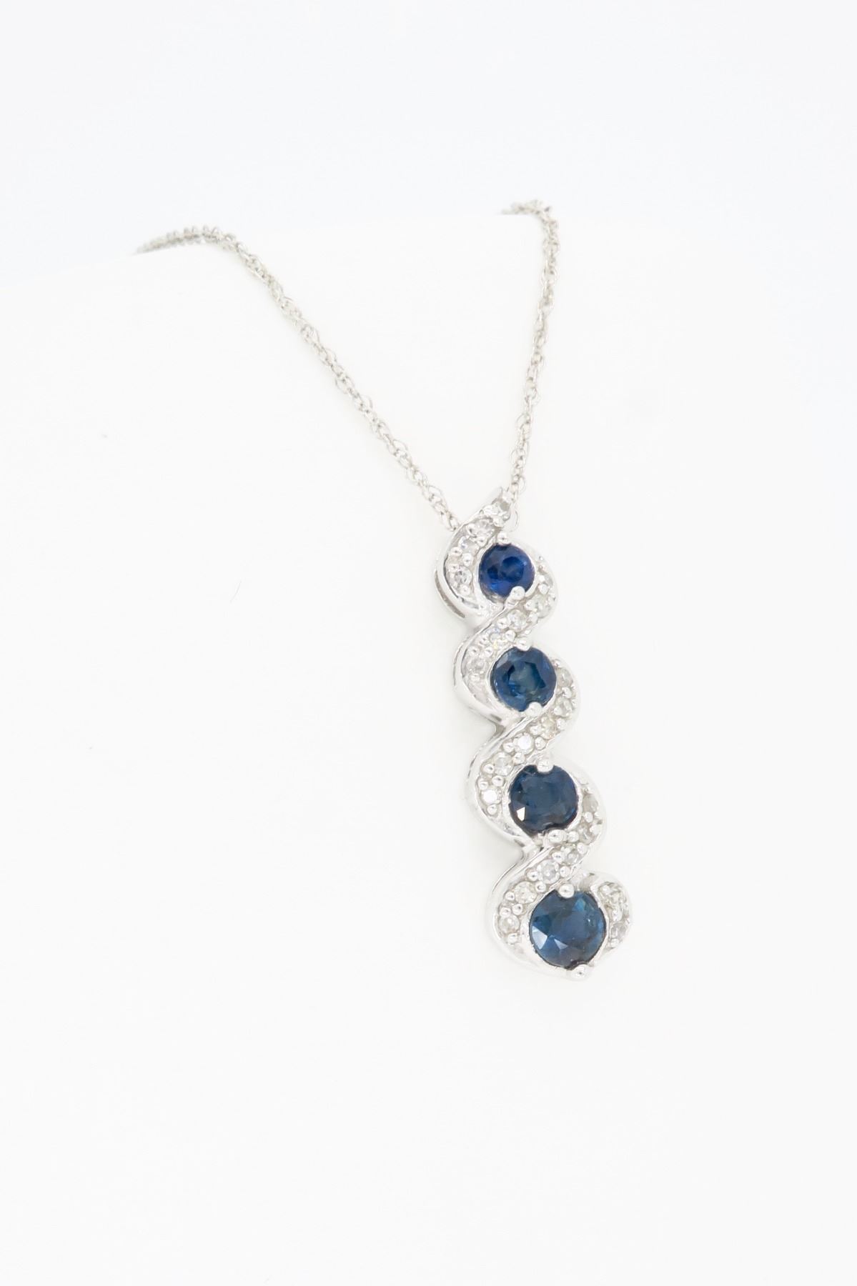 One 14KT White Gold 0.25ctw Diamond Pendant with Chain. 0.25cts of Diamonds and bluish green gemstones. Total weight of this pendant with chain is 2.2 grams. Total length of this chain is 18 inches.