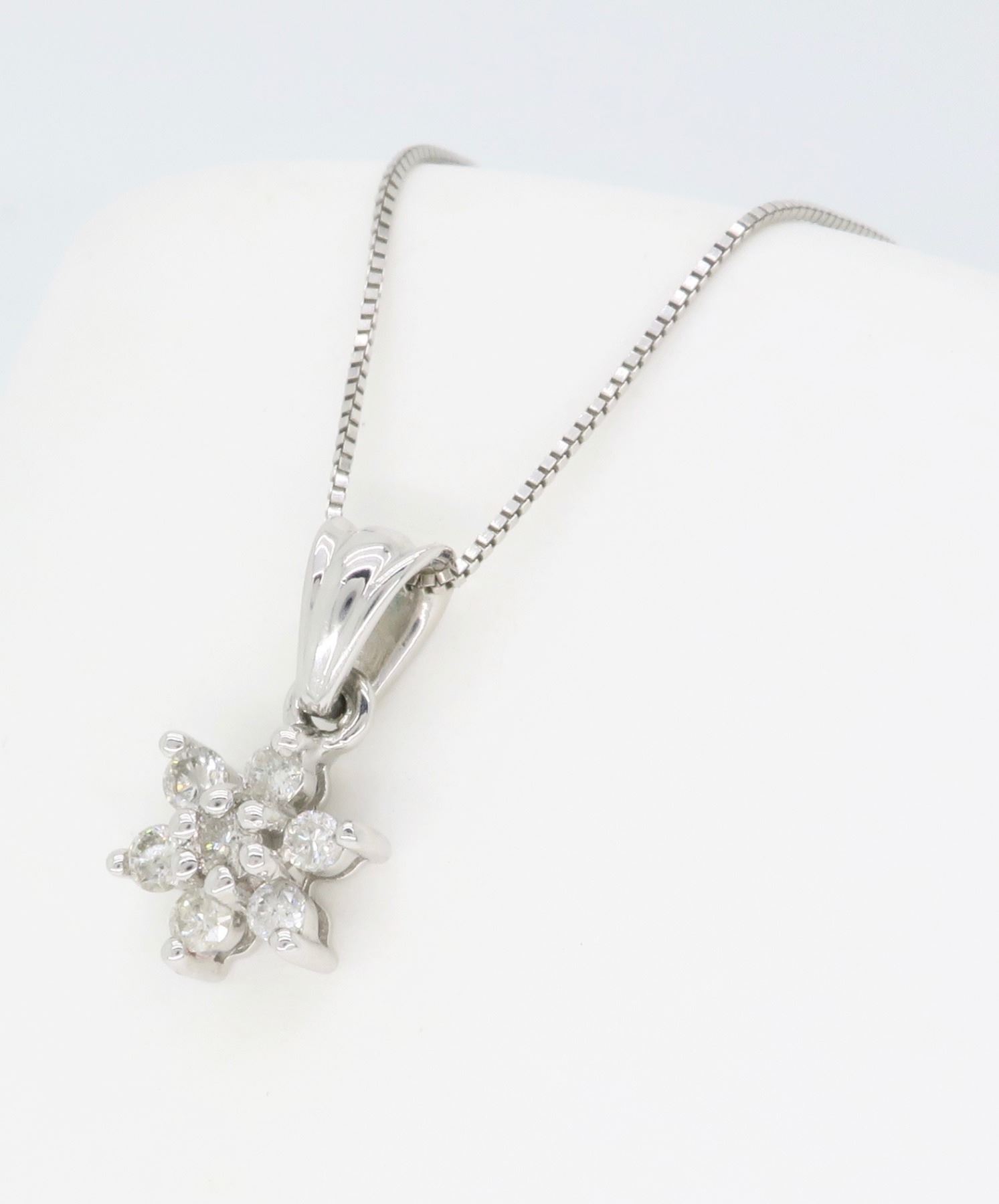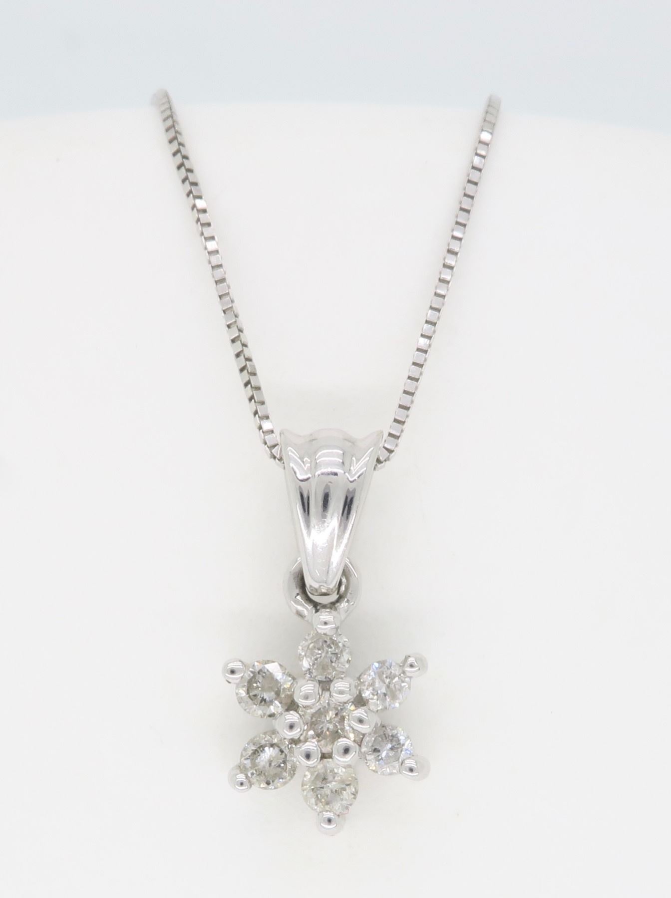 One 14KT White Gold 0.25ctw Diamond Pendant with Chain. Round Diamonds with a total weight of 0.25cts with a color of H-J and clarity of I-1. Total weight of this pendant with chain is 1.9 grams. Total length of this chain is 18 inches.