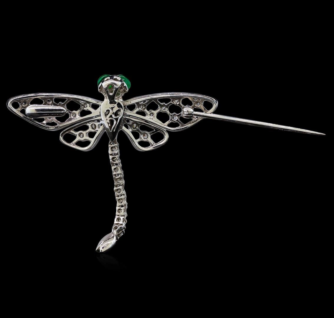 One electronically tested 14KT white gold ladies cast diamond and gem butterfly pin with a bright polish finish. Condition is very good. Containing: Two bezel set round cabochon cut natural emeralds, measuring 3.50 x 3.50 x 2.28mm, approximate total weight of 0.42ct., clarity is slightly included, type III, medium, moderately strong, green color, (GIA G 5/4), cut is good. One bezel set pear cabochon cut natural black onyx, measuring 8.50 x 3.00 x 1.95mm, approximate weight of 0.35ct., clarity is severely included, black, strong, black color, (GIA Bl 10/5), cut is good. Twenty-Seven gypsy set round brilliant cut diamonds, measuring 1.50 - 1.30 x 0.84mm (depth est.) approximate total weight of 27 Stones = 0.27ct. Clarity: SI-1. Color: H - I, Cut is Good. Colored gemstones are presumed to have been subjected to commonly used enhancement processes. All diamonds and colored gemstones are graded in the mounting, unless otherwise stated. Total Weight of Colored Stones 0.77ct. Total Weight of Diamonds 0.27ct. Total Weight of Butterfly Pin 6.10 grams. GGL Appraised at $1,500.00.