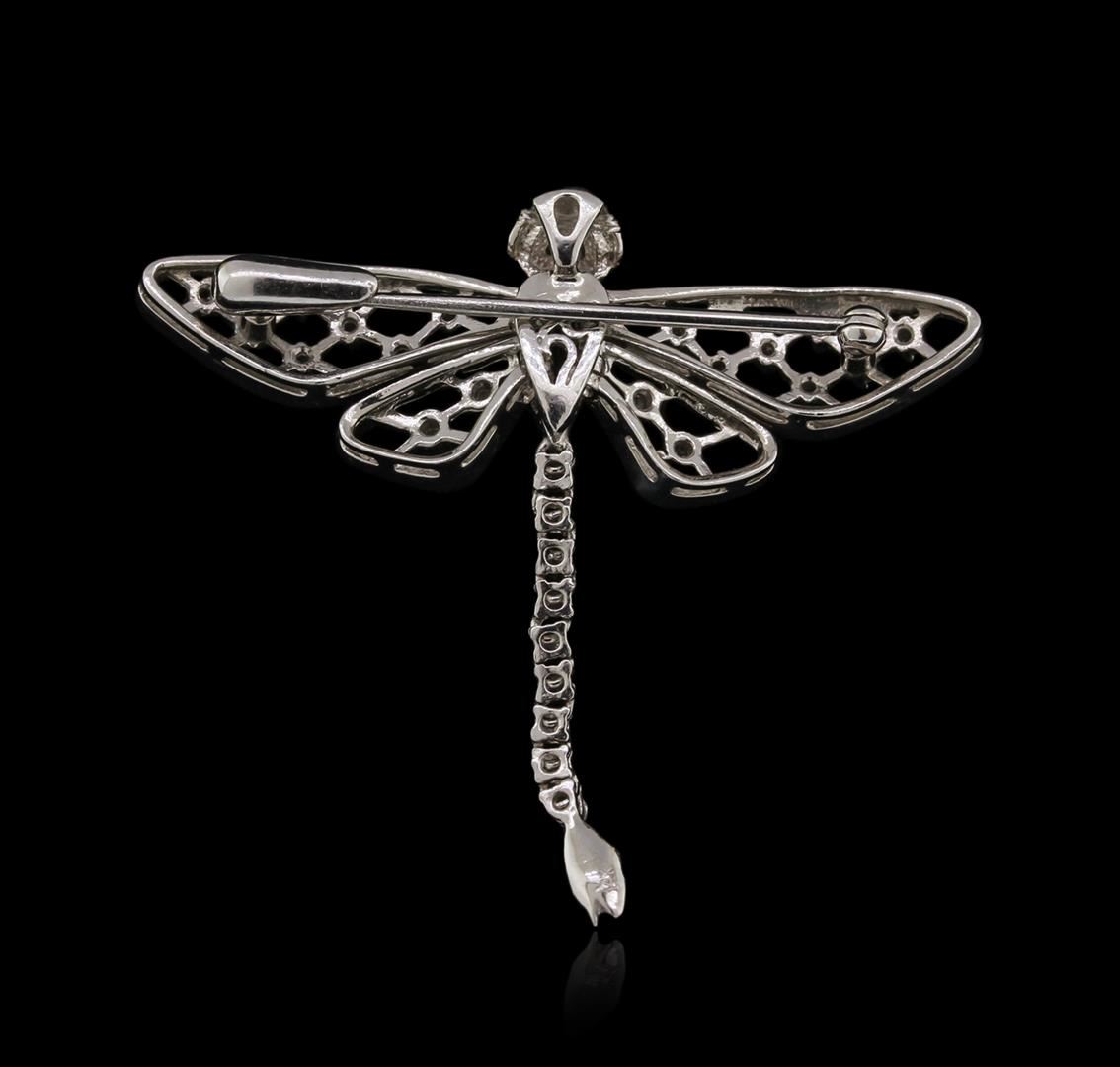 One electronically tested 14KT white gold ladies cast diamond and gem butterfly pin with a bright polish finish. Condition is very good. Containing: Two bezel set round cabochon cut natural emeralds, measuring 3.50 x 3.50 x 2.28mm, approximate total weight of 0.42ct., clarity is slightly included, type III, medium, moderately strong, green color, (GIA G 5/4), cut is good. One bezel set pear cabochon cut natural black onyx, measuring 8.50 x 3.00 x 1.95mm, approximate weight of 0.35ct., clarity is severely included, black, strong, black color, (GIA Bl 10/5), cut is good. Twenty-Seven gypsy set round brilliant cut diamonds, measuring 1.50 - 1.30 x 0.84mm (depth est.) approximate total weight of 27 Stones = 0.27ct. Clarity: SI-1. Color: H - I, Cut is Good. Colored gemstones are presumed to have been subjected to commonly used enhancement processes. All diamonds and colored gemstones are graded in the mounting, unless otherwise stated. Total Weight of Colored Stones 0.77ct. Total Weight of Diamonds 0.27ct. Total Weight of Butterfly Pin 6.10 grams. GGL Appraised at $1,500.00.