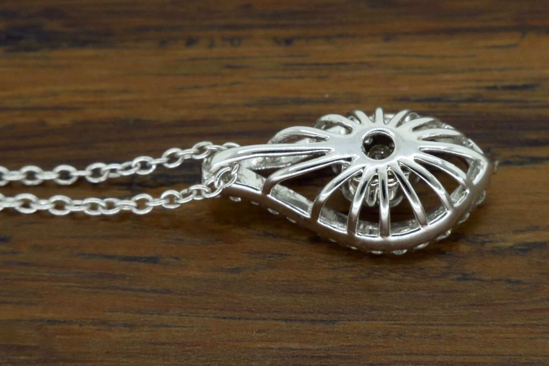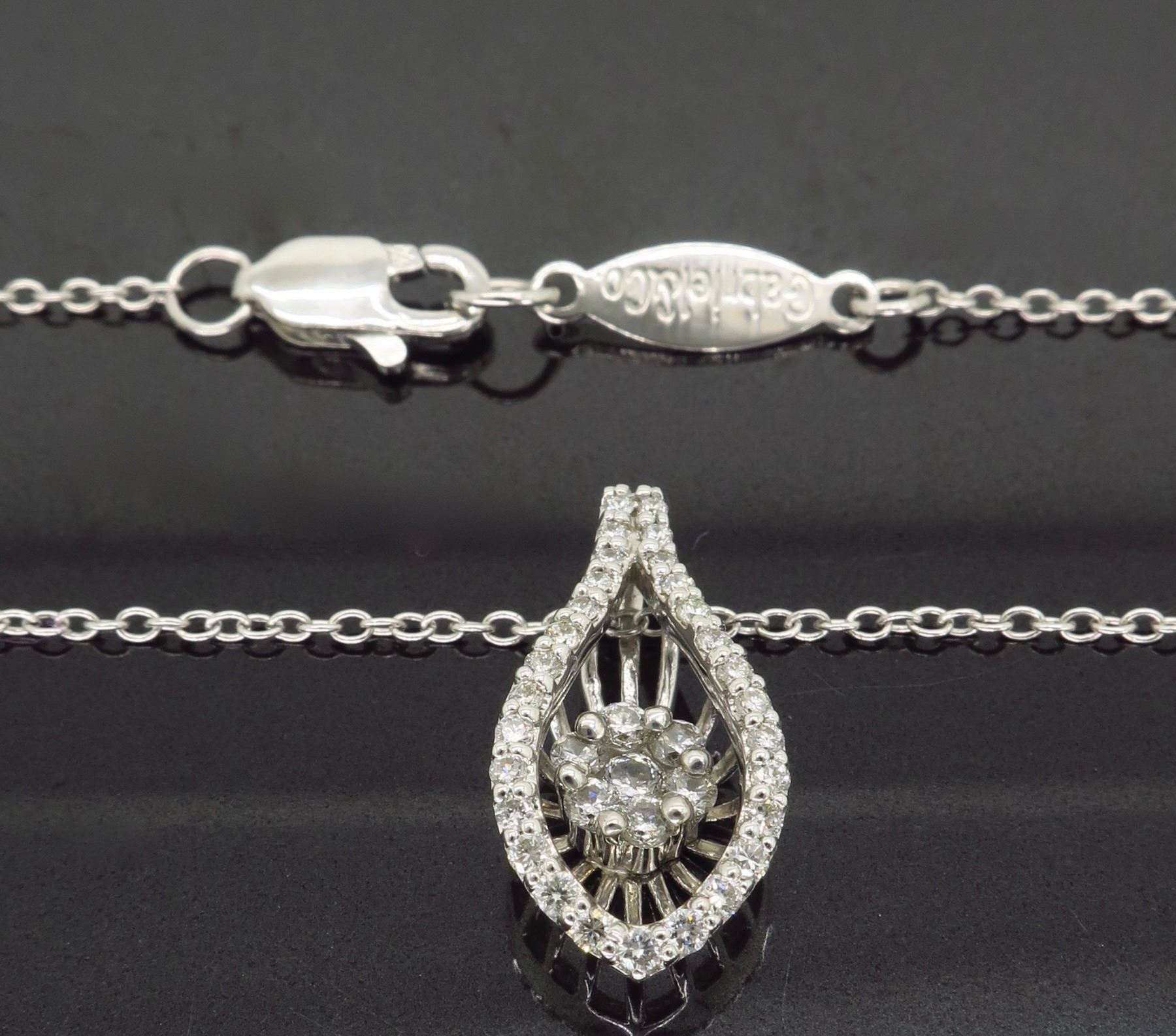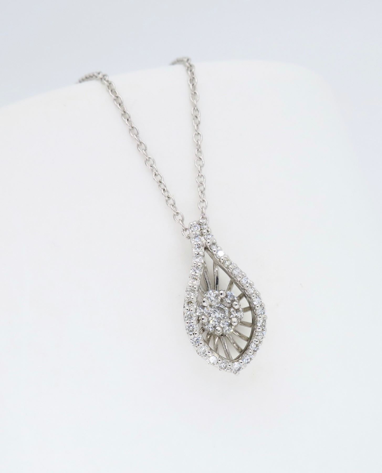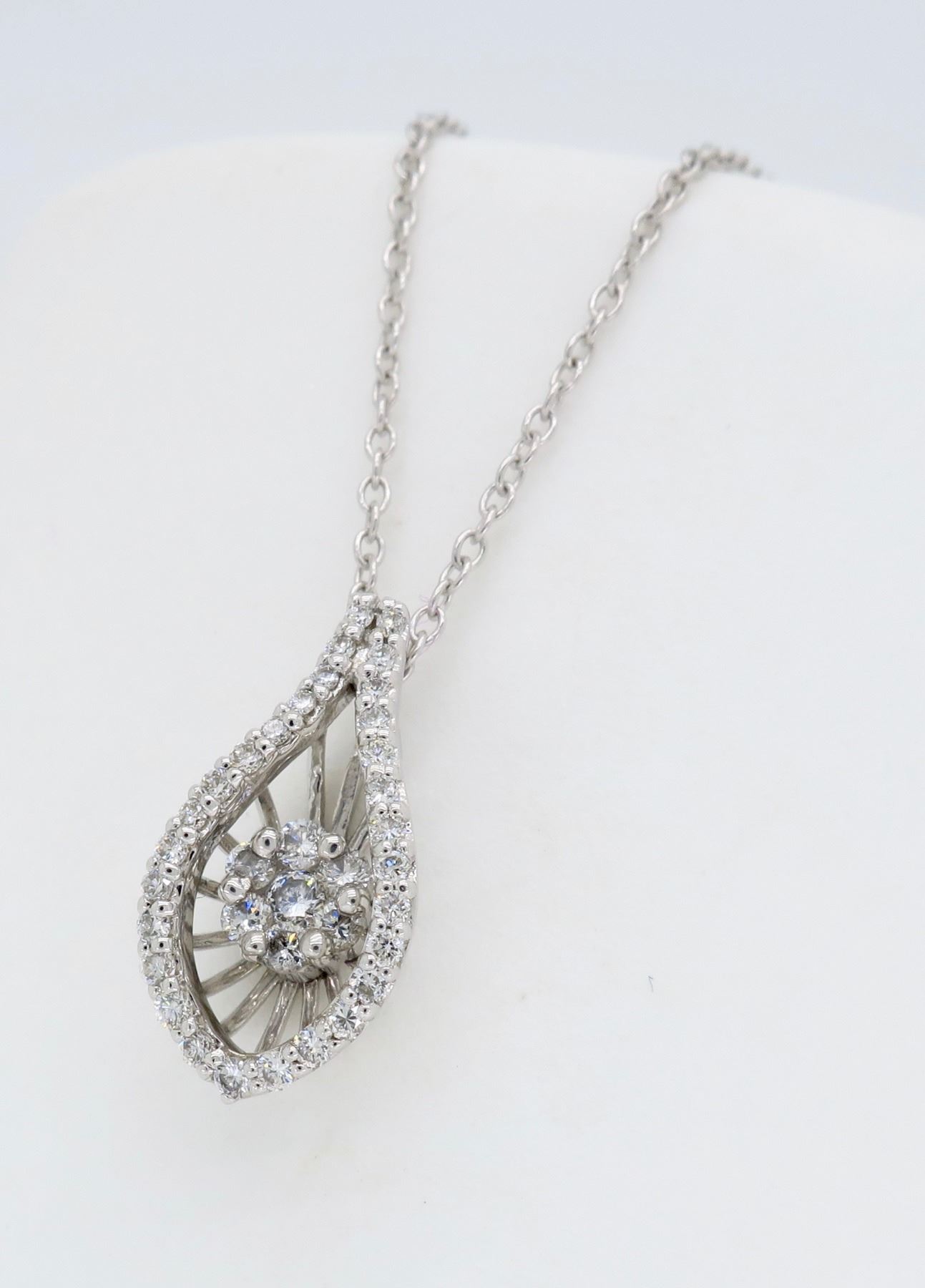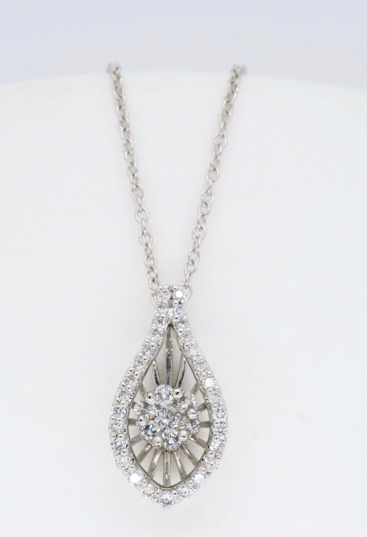 One 14KT White Gold 0.27ctw Diamond Pendant with Chain. (36) round Diamonds with a total weight of 0.27cts with a color of I-J and clarity of SI-2 to I-1. Total weight of this pendant is 2.7 grams. Length of this chain is 18 inches. Length of this pendant is 0.50 inches.