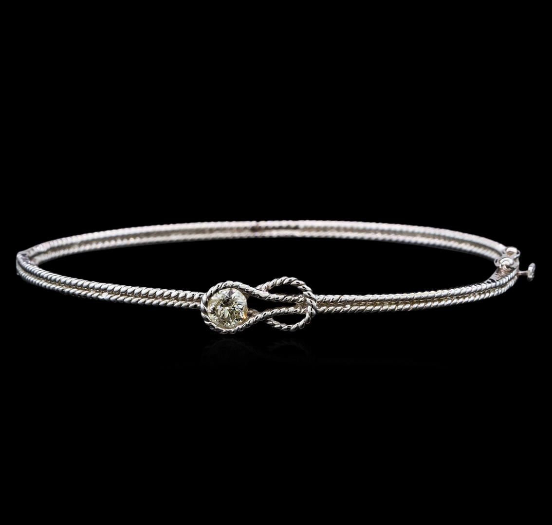 One electronically tested 14KT white gold ladies cast diamond bangle bracelet with a hidden box clasp with safety closer with a bright polish finish. Identified with markings of "14K". Condition is very good. Containing: One back setting set round brilliant cut diamond, measuring 4.50 - 4.50 x 2.70mm (depth est.) approximate weight of 0.33ct. Clarity: I-2. Color: I, Cut is Good. All diamonds are graded in the mounting, unless otherwise stated. Total Weight of Diamonds 0.33ct. Total Weight of Bangle Bracelet 7.00 grams. GGL Appraised at $1,405.00.