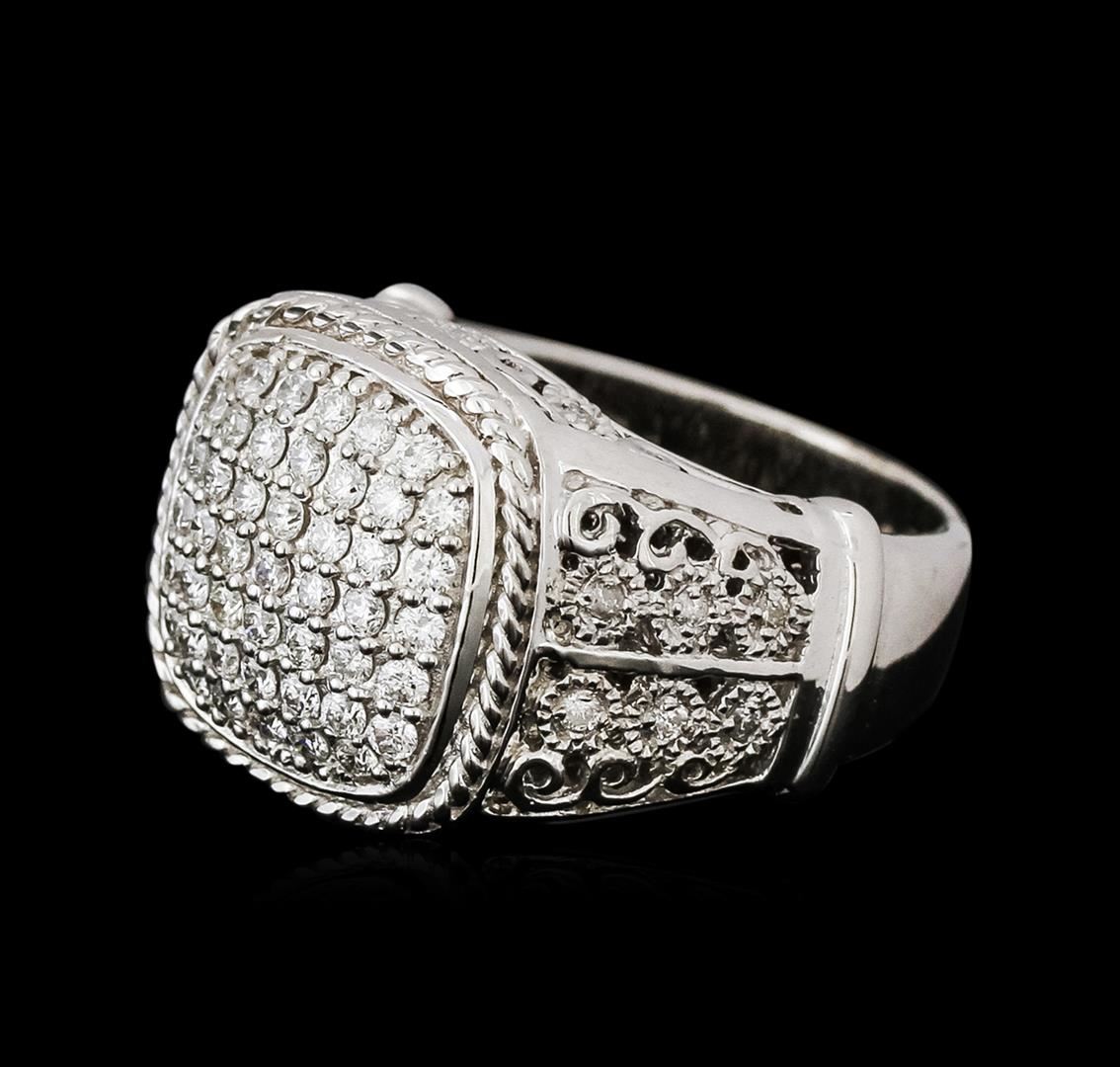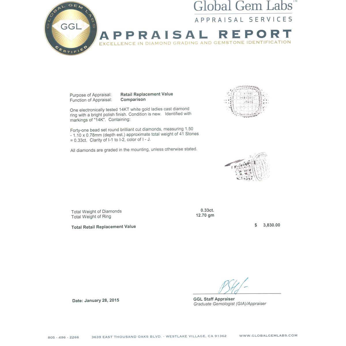 One electronically tested 14KT white gold ladies cast diamond ring with a bright polish finish. Identified with markings of "14K". Condition is new. Containing: Forty-One bead set round brilliant cut diamonds, measuring 1.50 - 1.10 x 0.78mm (depth est.) approximate total weight of 41 Stones = 0.33ct. Clarity: I-1 to I-2. Color: I - J. All diamonds are graded in the mounting, unless otherwise stated. Total Weight of Diamonds 0.33ct. Total Weight of Ring 12.70 grams. GGL Appraised at $3,830.00.