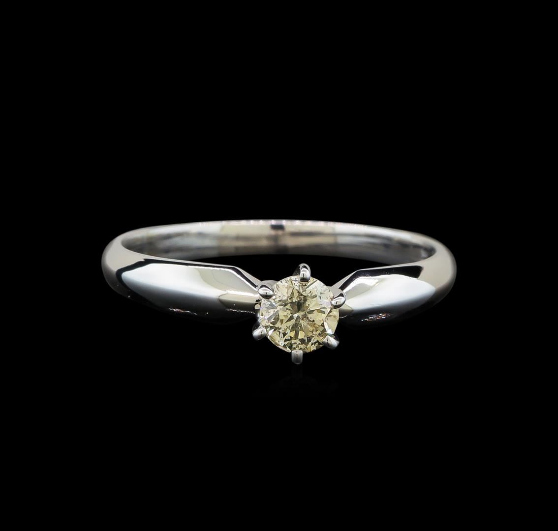 One electronically tested 14KT white gold ladies cast diamond solitaire ring with a half round shank with a bright polish finish. Identified with markings of "14K". Condition is new. Containing: One prong set round brilliant cut diamond, measuring 4.40 - 4.40 x 2.64mm (depth est.) exact weight 0.33ct. Clarity: I-2. Color: L, Cut is Good. Diamonds are graded in the mounting, unless otherwise stated. Total Weight of Diamonds 0.33ct. Total Weight of Solitaire Ring 2.30 grams. GGL Appraised at $845.00.