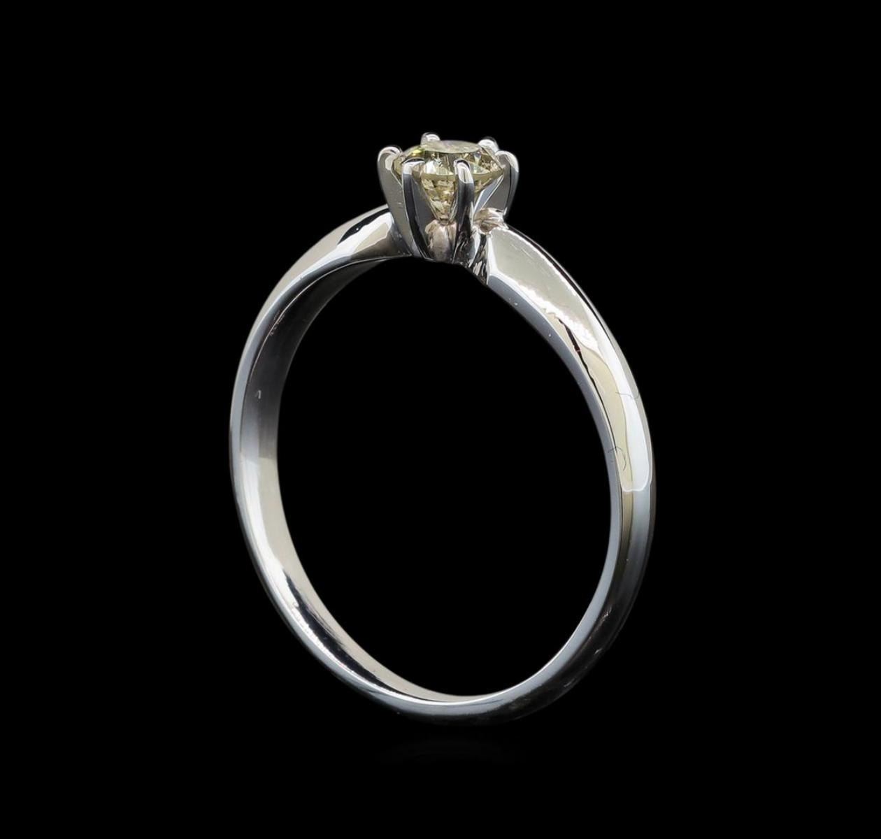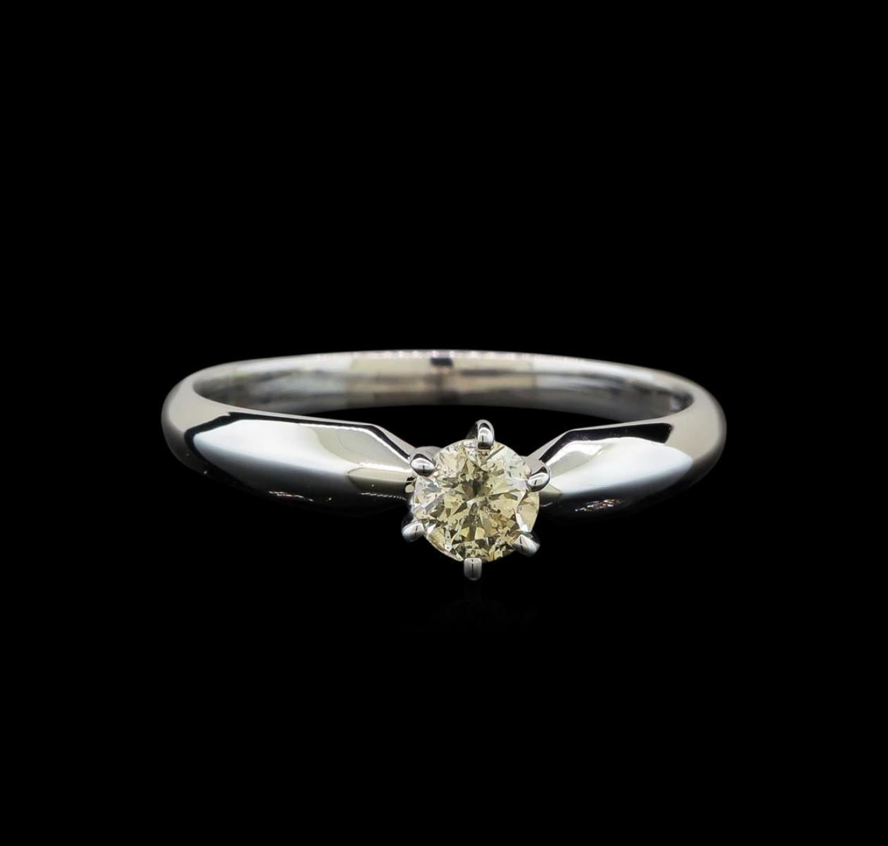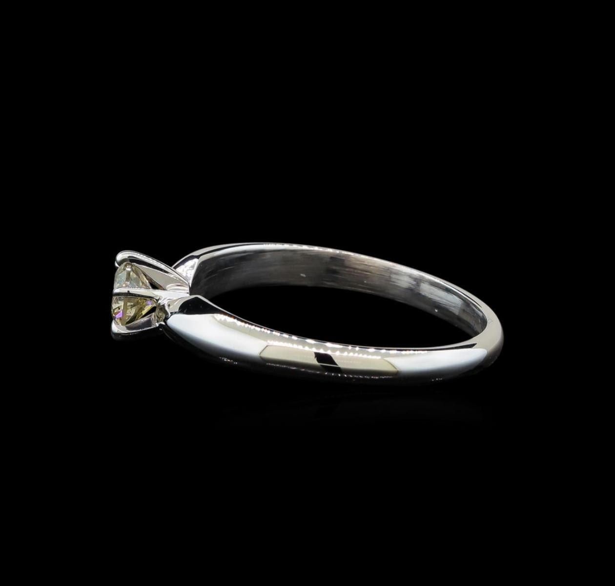 One electronically tested 14KT white gold ladies cast diamond solitaire ring with a half round shank with a bright polish finish. Identified with markings of "14K". Condition is new. Containing: One prong set round brilliant cut diamond, measuring 4.40 - 4.40 x 2.64mm (depth est.) exact weight 0.33ct. Clarity: I-2. Color: L, Cut is Good. Diamonds are graded in the mounting, unless otherwise stated. Total Weight of Diamonds 0.33ct. Total Weight of Solitaire Ring 2.30 grams. GGL Appraised.
