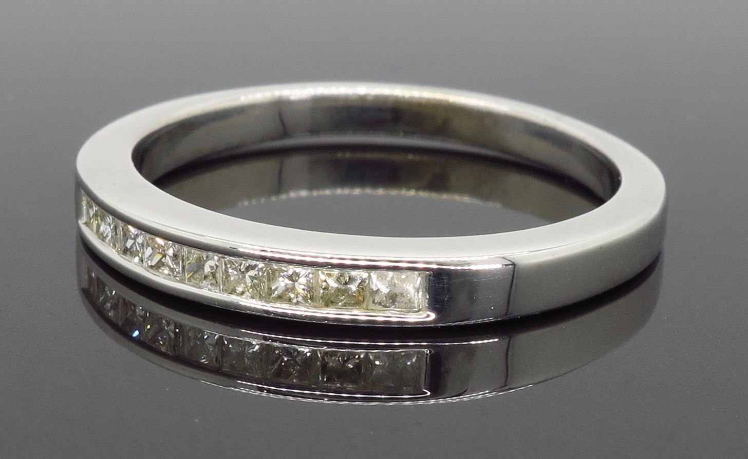 One 14KT White Gold 0.33ctw Diamond Ring. Princess cut Diamonds with a total weight of 0.33cts with a color of H-J and clarity of SI-1. Total weight of this ring is 4.0 grams. Ring size is 9.25.