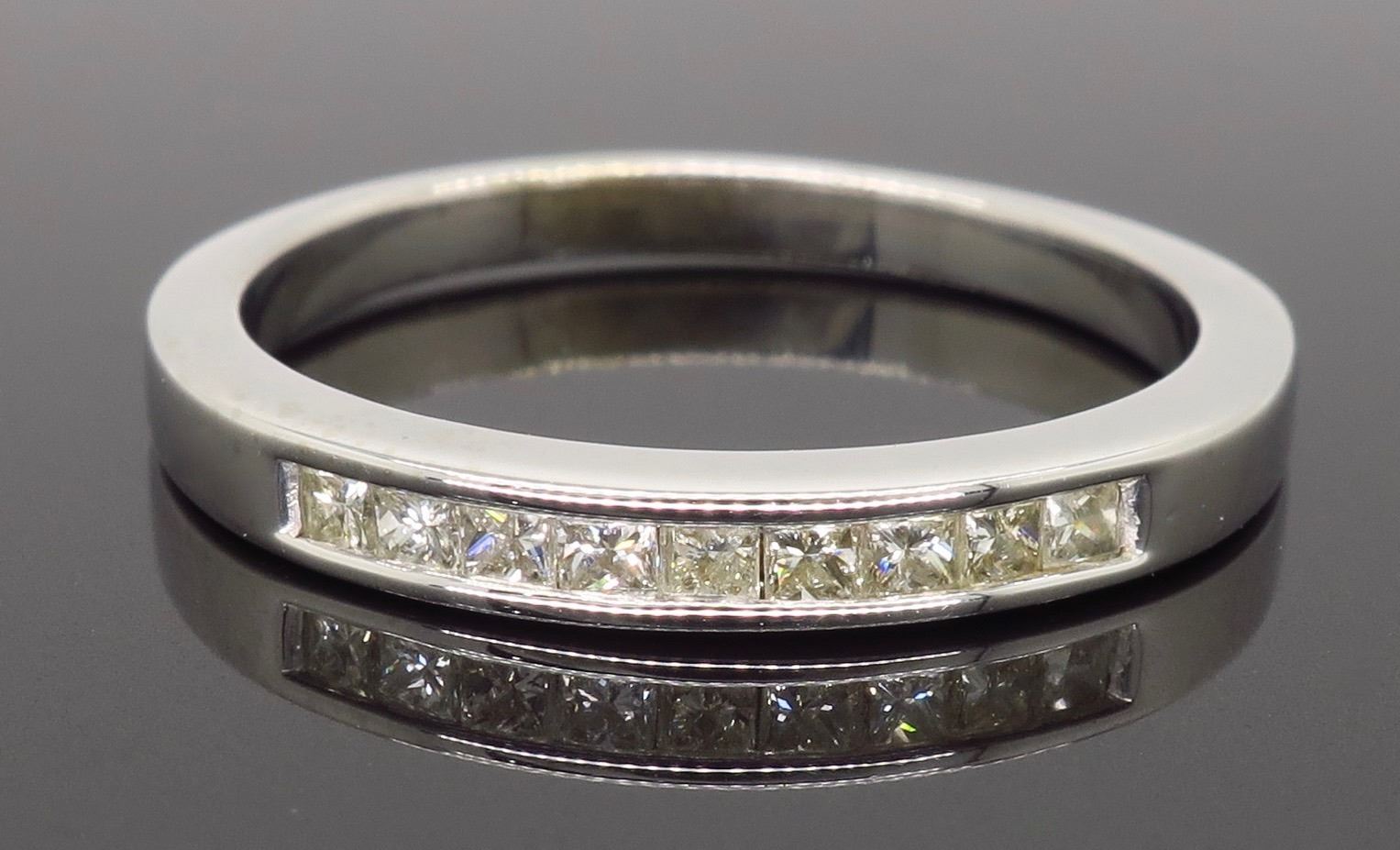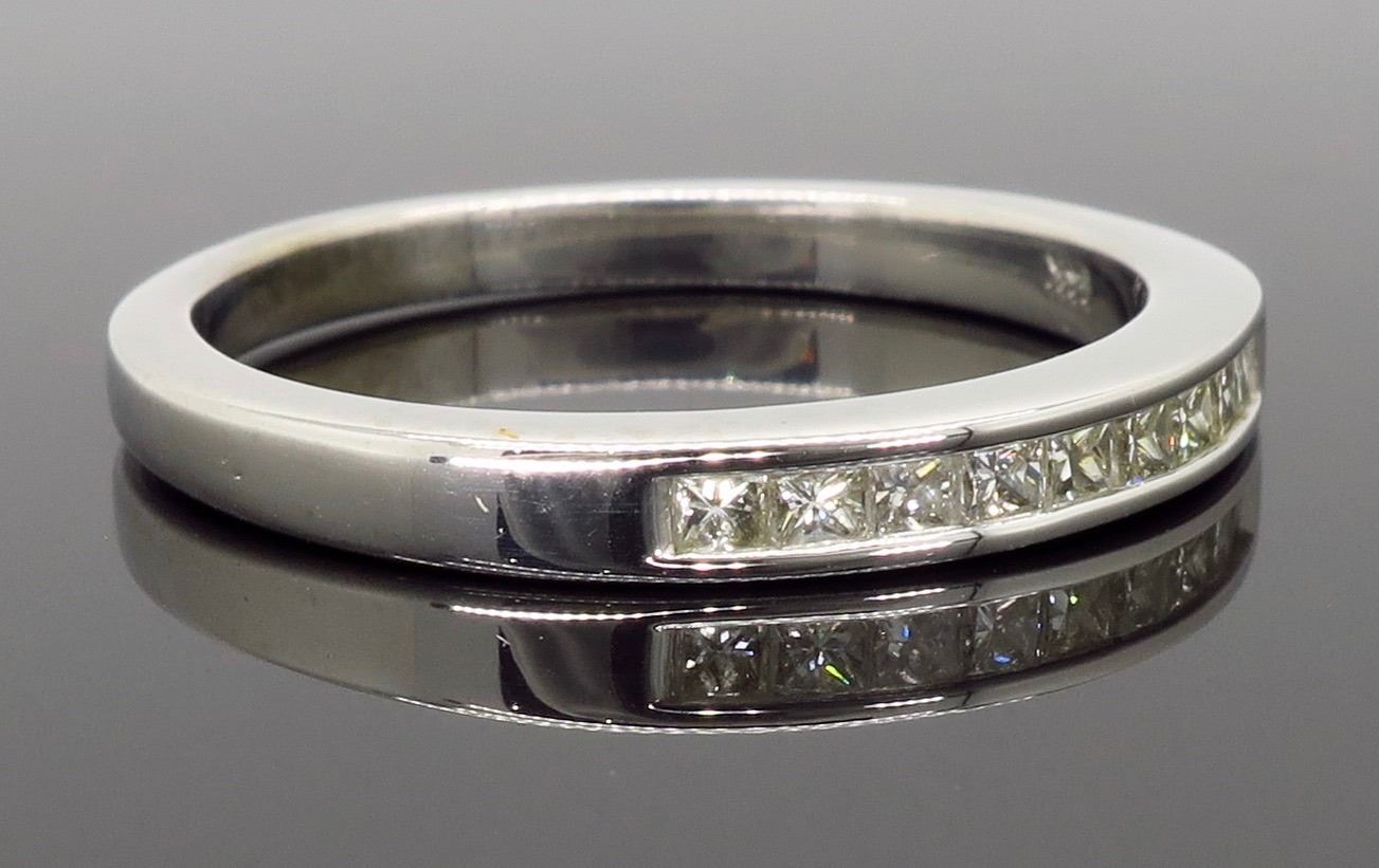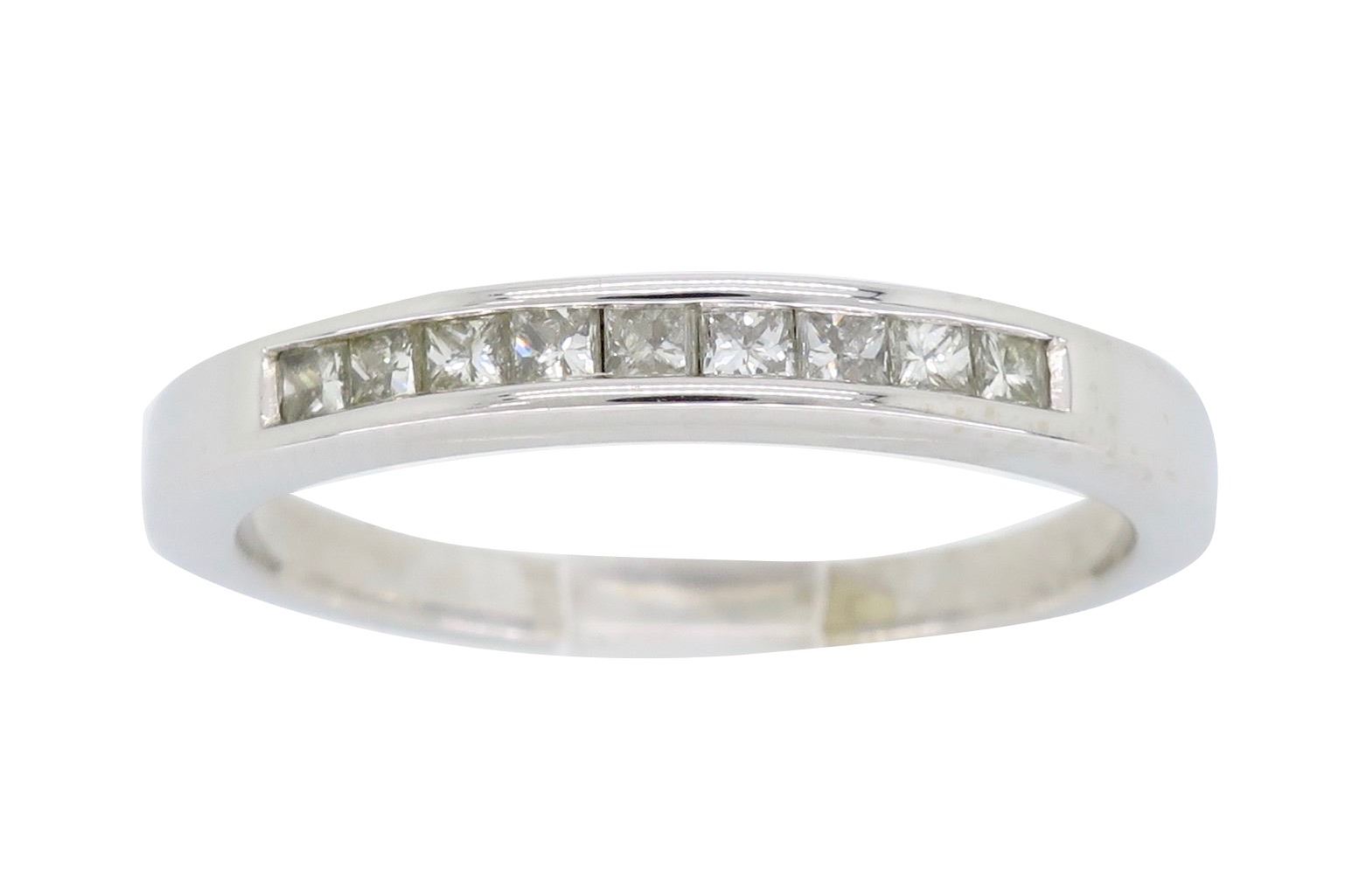 One 14KT White Gold 0.33ctw Diamond Ring. Princess cut Diamonds with a total weight of 0.33cts with a color of H-J and clarity of SI-1. Total weight of this ring is 4.0 grams. Ring size is 9.25.