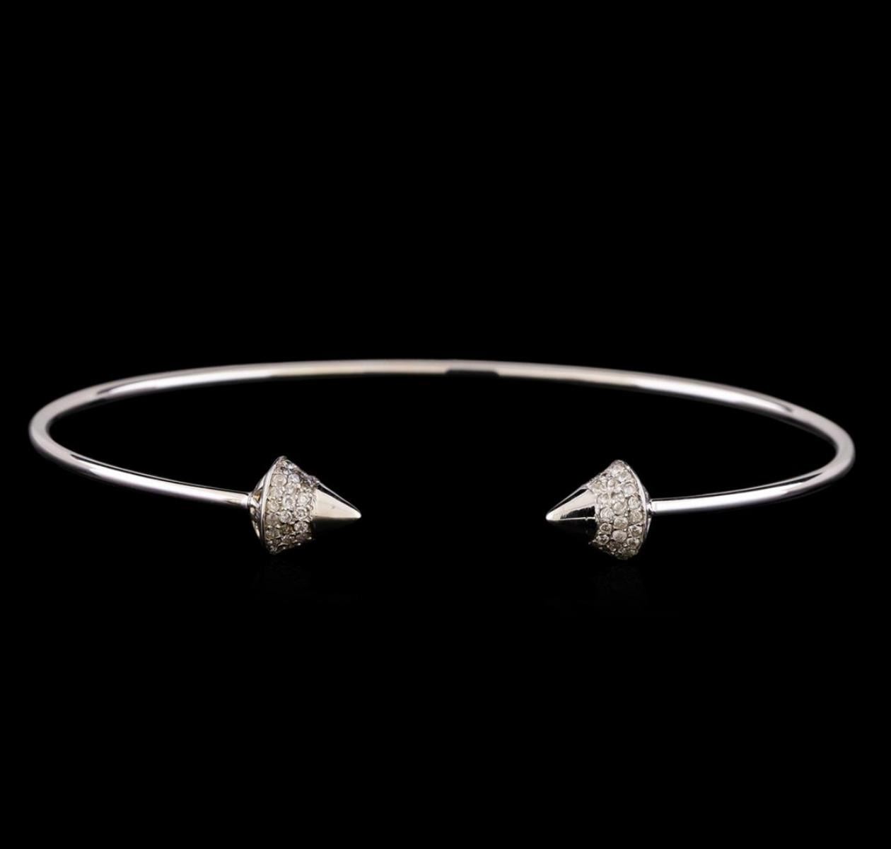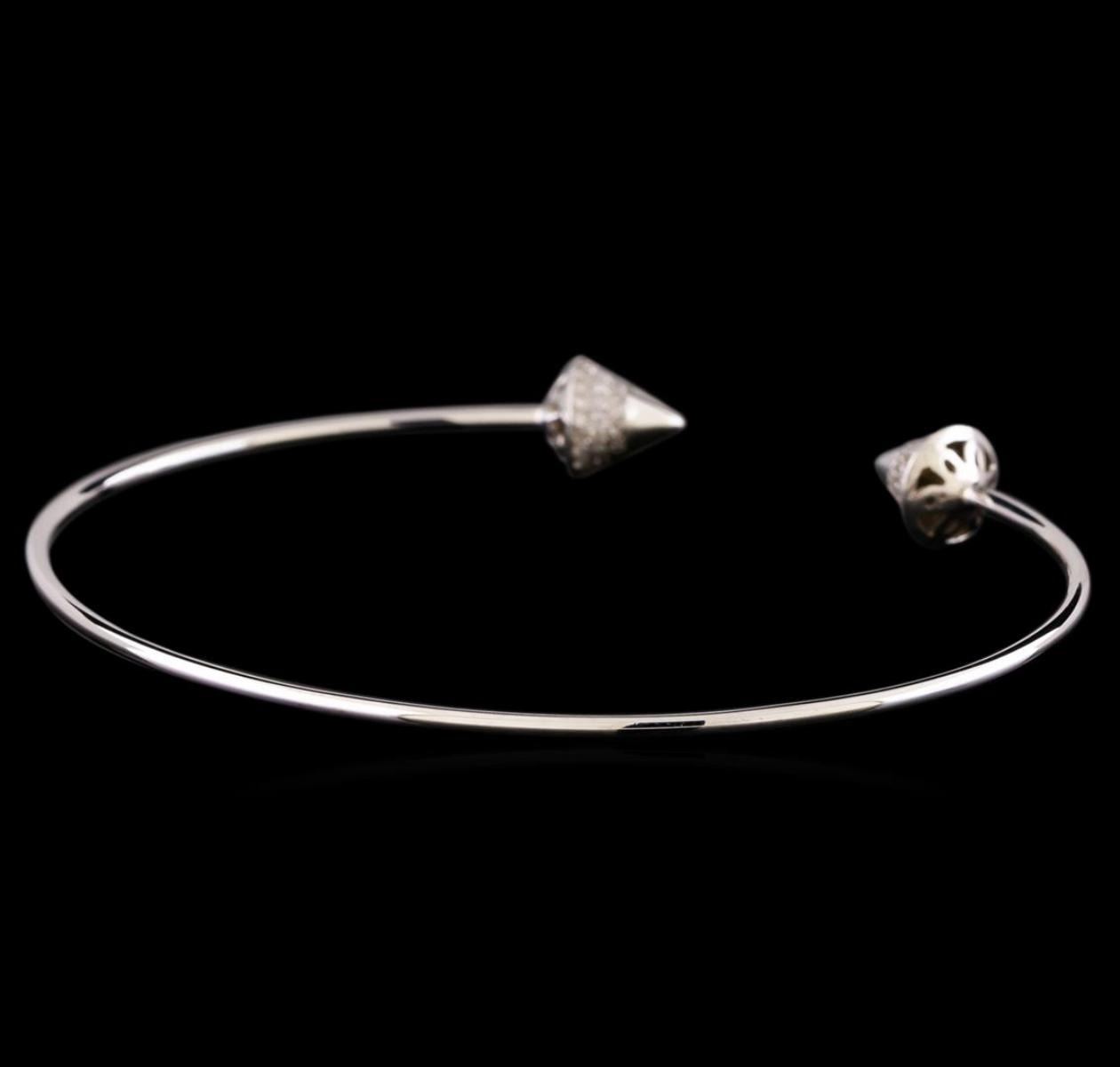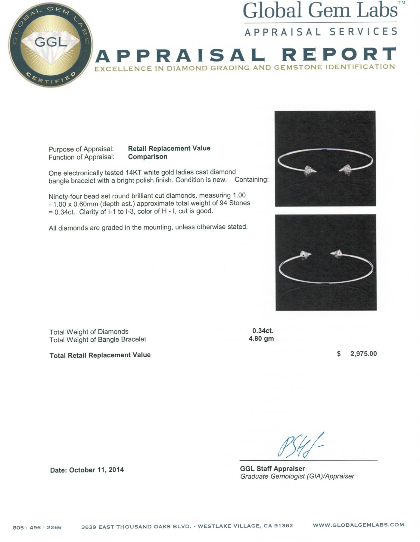 One electronically tested 14KT white gold ladies cast diamond bangle bracelet with a bright polish finish. Condition is new. Containing: Ninety-Four bead set round brilliant cut diamonds, measuring 1.00 - 1.00 x 0.60mm (depth est.) approximate total weight of 94 Stones = 0.34ct. Clarity: I-1 to I-3. Color: H - I, Cut is Good. All diamonds are graded in the mounting, unless otherwise stated. Total Weight of Diamonds 0.34ct. Total Weight of Bangle Bracelet 4.80 grams. GGL Appraised.