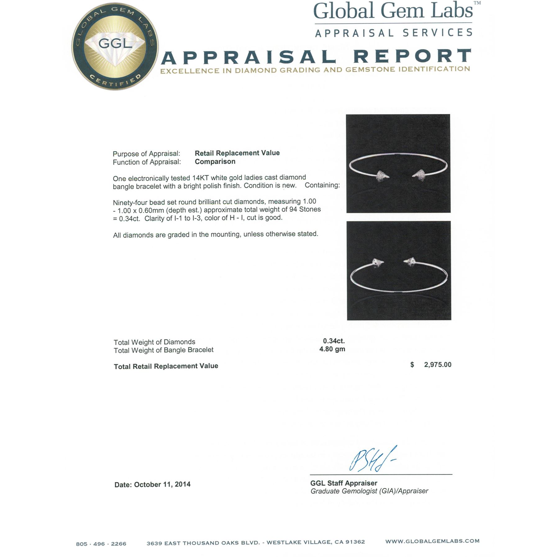 One electronically tested 14KT white gold ladies cast diamond bangle bracelet with a bright polish finish. Condition is new. Containing: Ninety-Four bead set round brilliant cut diamonds, measuring 1.00 - 1.00 x 0.60mm (depth est.) approximate total weight of 94 Stones = 0.34ct. Clarity: I-1 to I-3. Color: H - I, Cut is Good. All diamonds are graded in the mounting, unless otherwise stated. Total Weight of Diamonds 0.34ct. Total Weight of Bangle Bracelet 4.80 grams. GGL Appraised.